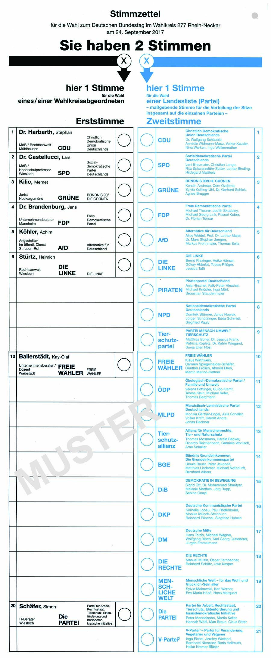 (zg) Der Wahlkampf geht auch im Rhein-Neckar-Kreis in die heiße Phase. Etwa 199.000 Wahlberechtigte sind am 24. September im Wahlkreis 277 Rhein-Neckar zur Stimmabgabe aufgerufen, darunter 5,3 Prozent Erstwähler. Sie können ihre Erststimme an 8 Kandidatinnen und Kandidaten vergeben, die sich in diesem Wahlkreis um das Direktmandat bewerben. Mit der Zweitstimme sind die Landeslisten von insgesamt 21 Parteien wählbar. Die Zweitstimmenanteile der einzelnen Parteien sind entscheidend für die Zusammensetzung des Bundestags.