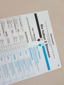 Der Stimmzettel zur Bundestagswahl ist übrigens an der oberen rechten Ecke wieder gelocht. Dies hilft blinden oder hochgradig sehbehinderten Menschen dabei, eine Stimmzettelschablone anzulegen. Sie ist ein Hilfsmittel, mit dem sie den wesentlichen Inhalt des Stimmzettels mit den Fingern lesen und im Wahllokal oder bei der Briefwahl eigenständig und geheim wählen können.