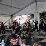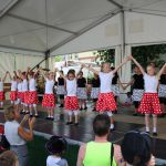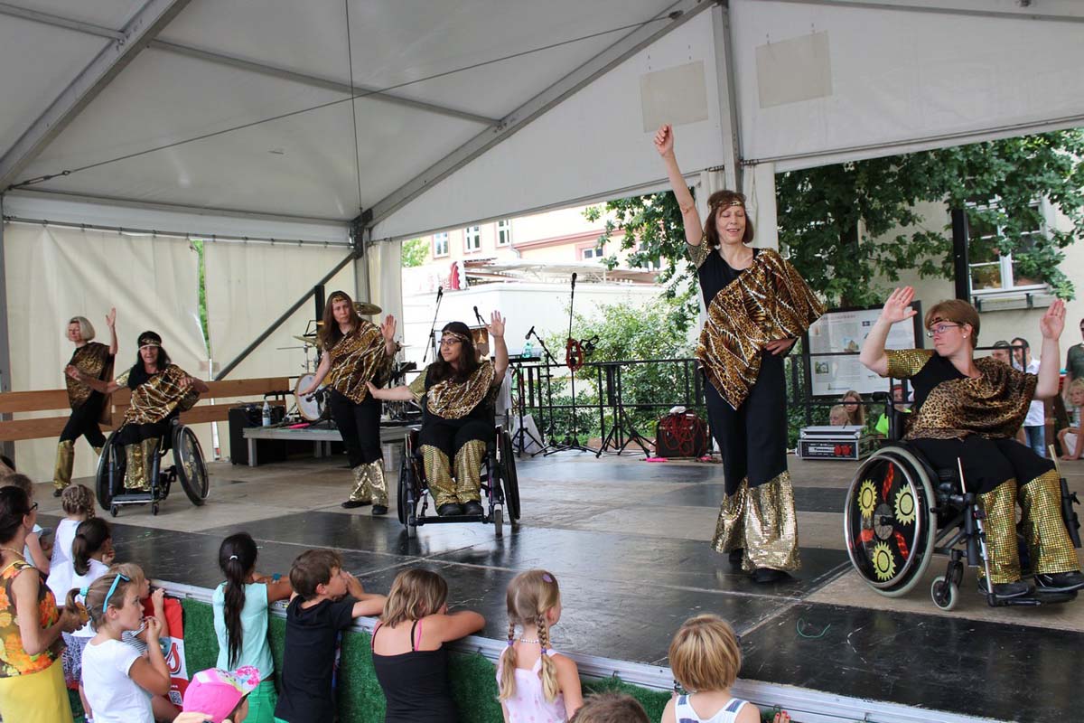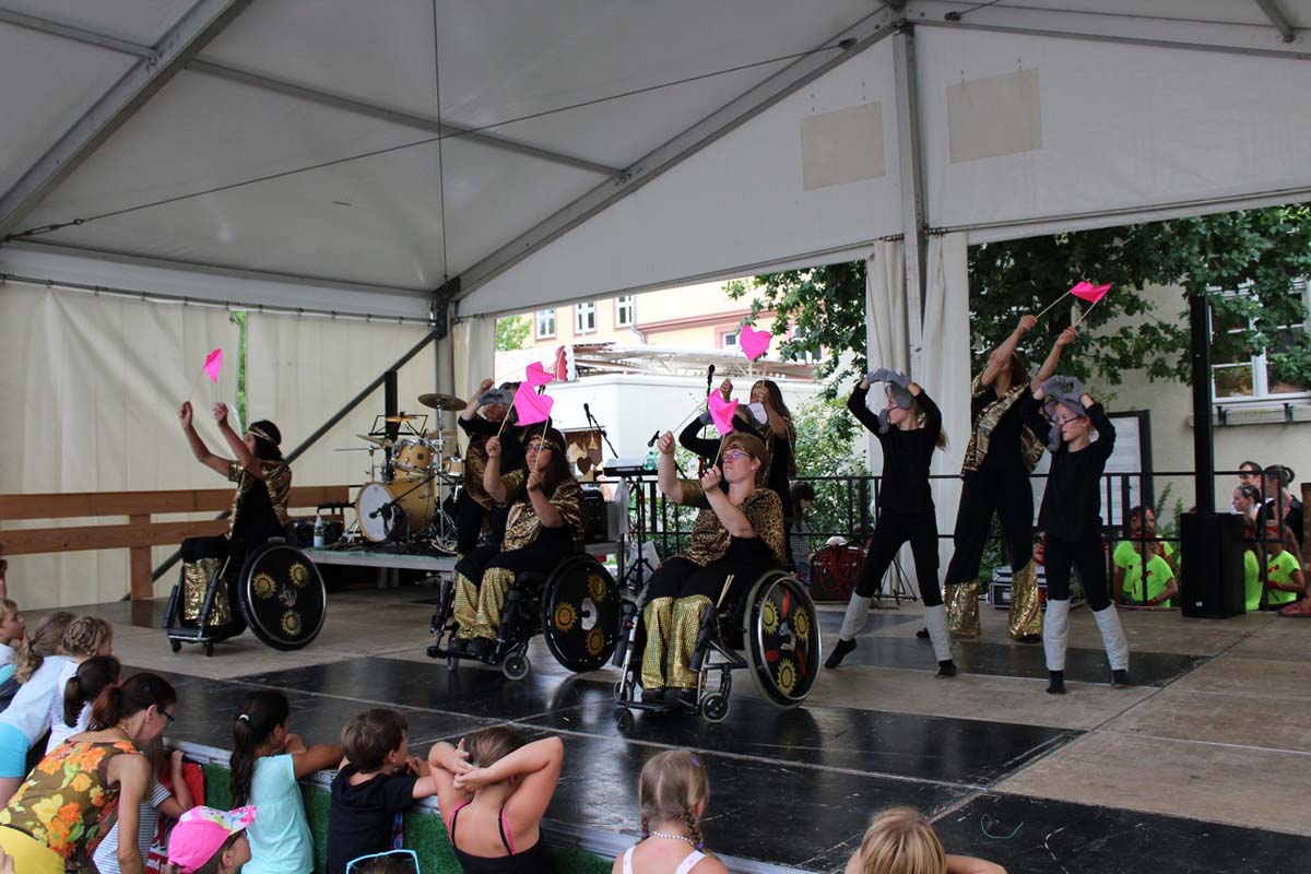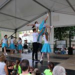 (zg) Der Tanzsportclub Rot-Gold Sinsheim präsentierte im Rahmen des Stadtfestes Neckarbischofsheim einen bunten Querschnitt durch sein Tanzangebot. Über eine Stunde Tanzprogramm unter der Leitung von Piti Lessmann gab es für die Zuschauer auf der grossen Bühne vor dem alten Rathaus. Tanzkinder aus Sinsheim und Waibstadt im Alter von 3 – 16 Jahren zeigten Kindertanzen als kleine Hexen oder Showdance mit dem „Trendspielzeug“ Fidget Spinner. Aus Sinsheim kam die Rock and Roll-Formation „Crazy Kicks“ mit flotter James Bond-Choreographie und die „Sterne des Orients“ mit Seidentuch-Präsentation. Das Neckarbischofsheimer Geschwisterpaar, Anastasia und Viktor Jäger, wirbelte im Turnieroutfit mit lateinamerikanischen Tänzen über die Bühne. Die Line Dancer „60 Plus“ aus Waibstadt präsentierten Ihren Sommerwalzer, Trotz Hitze und eigentlich „ 80 Plus“ zeigten Sie Freude und Tanzenergie auf der Bühne. Auch die Rollstuhltanzformation „Rhythm on wheels“ passte zu dem heissen Sommertag mit Ihrer Choreographie „Dschungel“. Die Rollstuhtänzer hatten Ihre Mühe mit den Unebenheiten der Bühne, meisterten dies aber mit Routine. Es war insgesamt ein abwechslungsreiches Nachmittagsprogramm, unterhaltsam moderiert von Andreas Lessmann.Bunte Tanzpallette mit Fidget Spinner, Seidentüchern und Hula Hoop