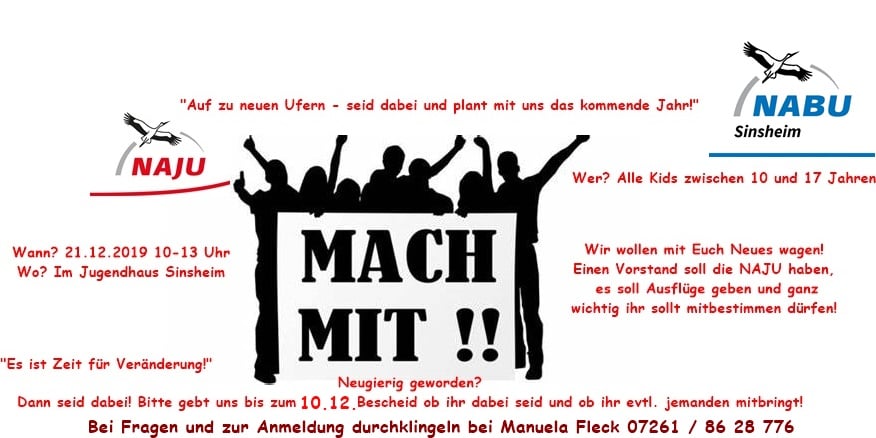 NABU Sinsheim lädt ein am 21.12.2019 von 10 - 13 Uhr im Jugendhaus Sinsheim Du bist zwischen 10 und 17 Jahren und möchtest Dich für die Umwelt, die Natur vor unserer Hausür...