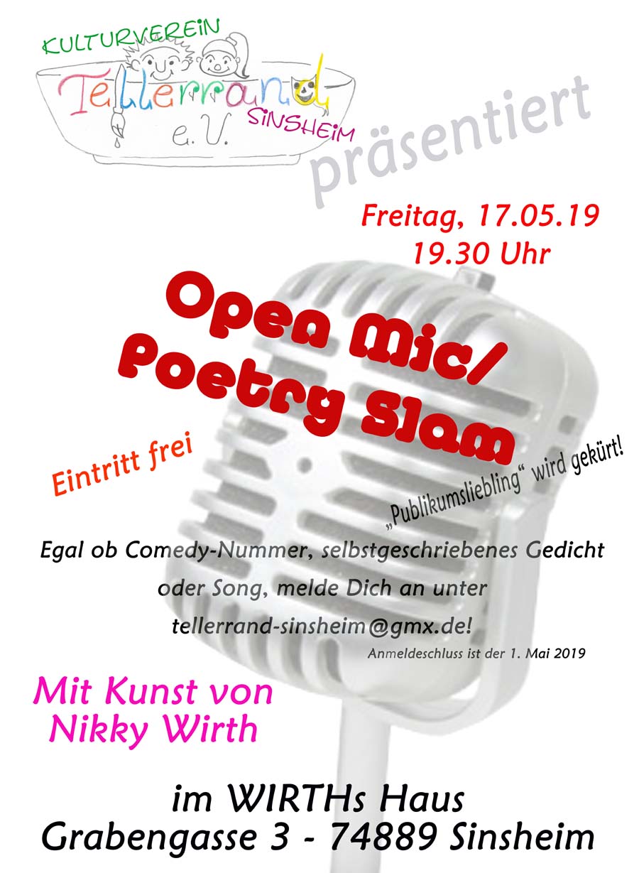 Open Mic am 17.05.2019 um 19.30 im WIRTHs HAUS in Sinsheim, Grabengasse 3. Du hast ein Gedicht geschrieben? Einen eigenen Song komponiert? Oder hast Du einfach nur eine lustige...