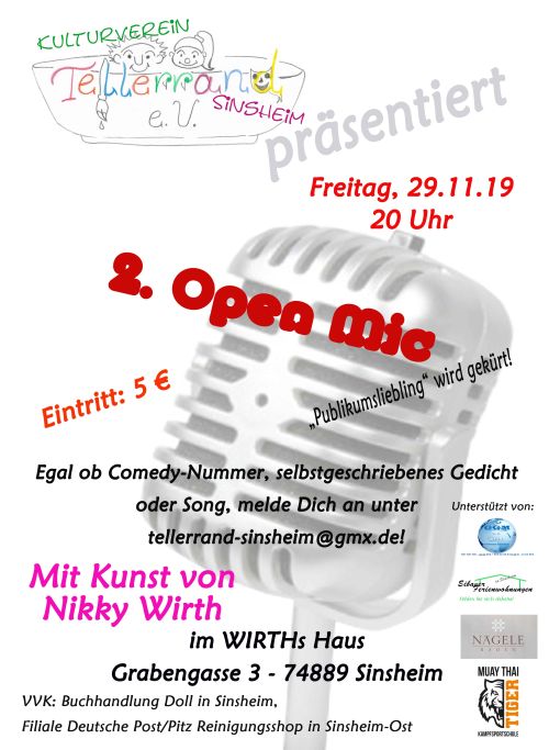 Freitag, 29.11.2019 , 20.00 Uhr im Wirth´s´Haus Freie Bühne. Offenes Mikrofon. Zum zweiten Mal lädt der Kulturverein Tellerrand Sinsheim e.V. zum Open Mic im Wirths-Haus ein....