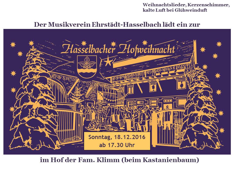 Sonntag 18. Dezember 2016 ab 17.30 Uhr im Hof der Fam. Klimm (beim Kastanienbaum) Der Musikverein Ehrstädt Hasselbach lädt ein zure Hasselbacher Hofweihnacht Weihnachtslieder,...