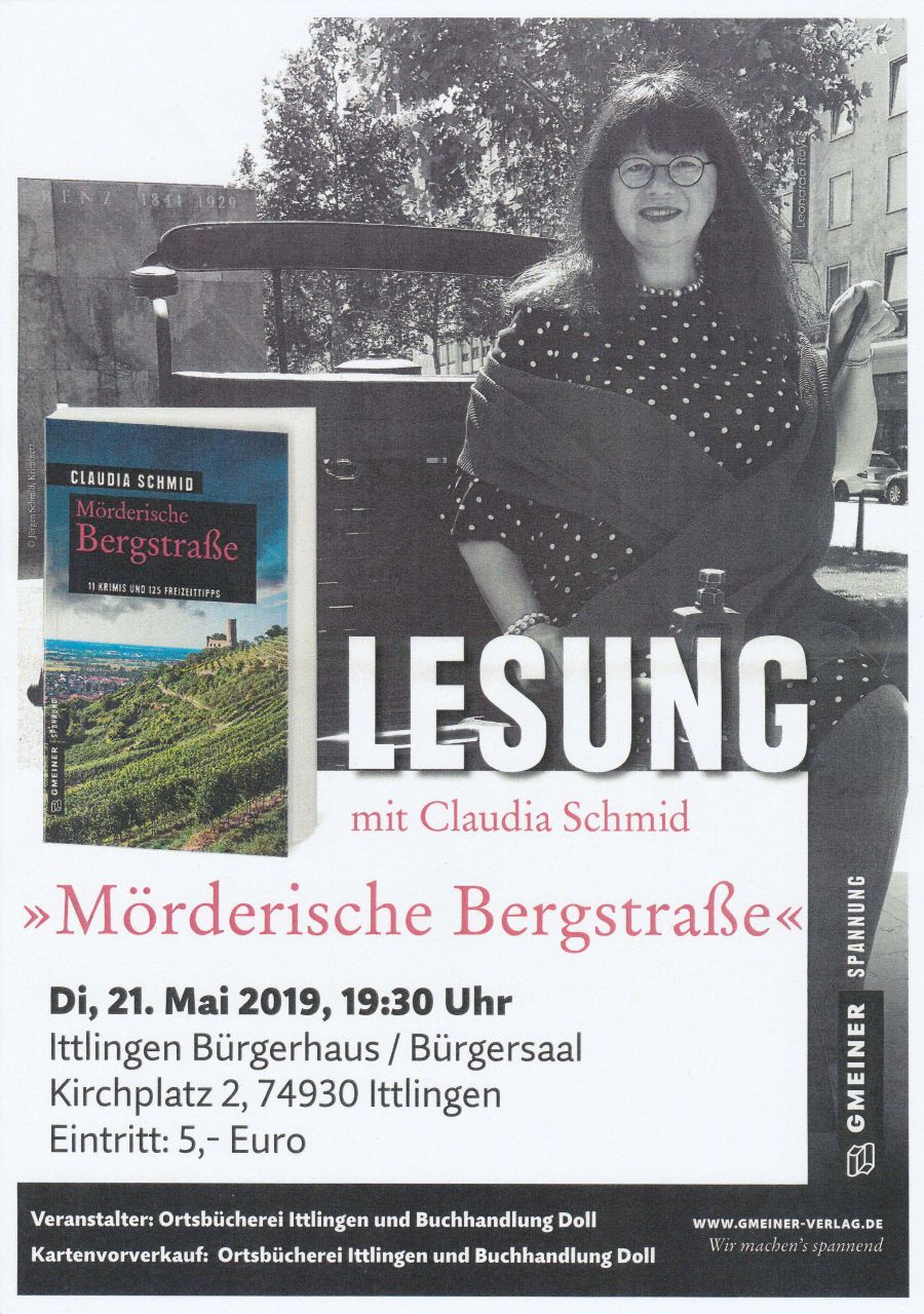 (zg) Am Dienstag, 21. Mai 2019 veranstaltet die Ortsbücherei Ittlingen und die Buchhandlung Doll eine Lesung mit Claudia Schmid „Mörderische Bergstraße“. In elf spannenden...
