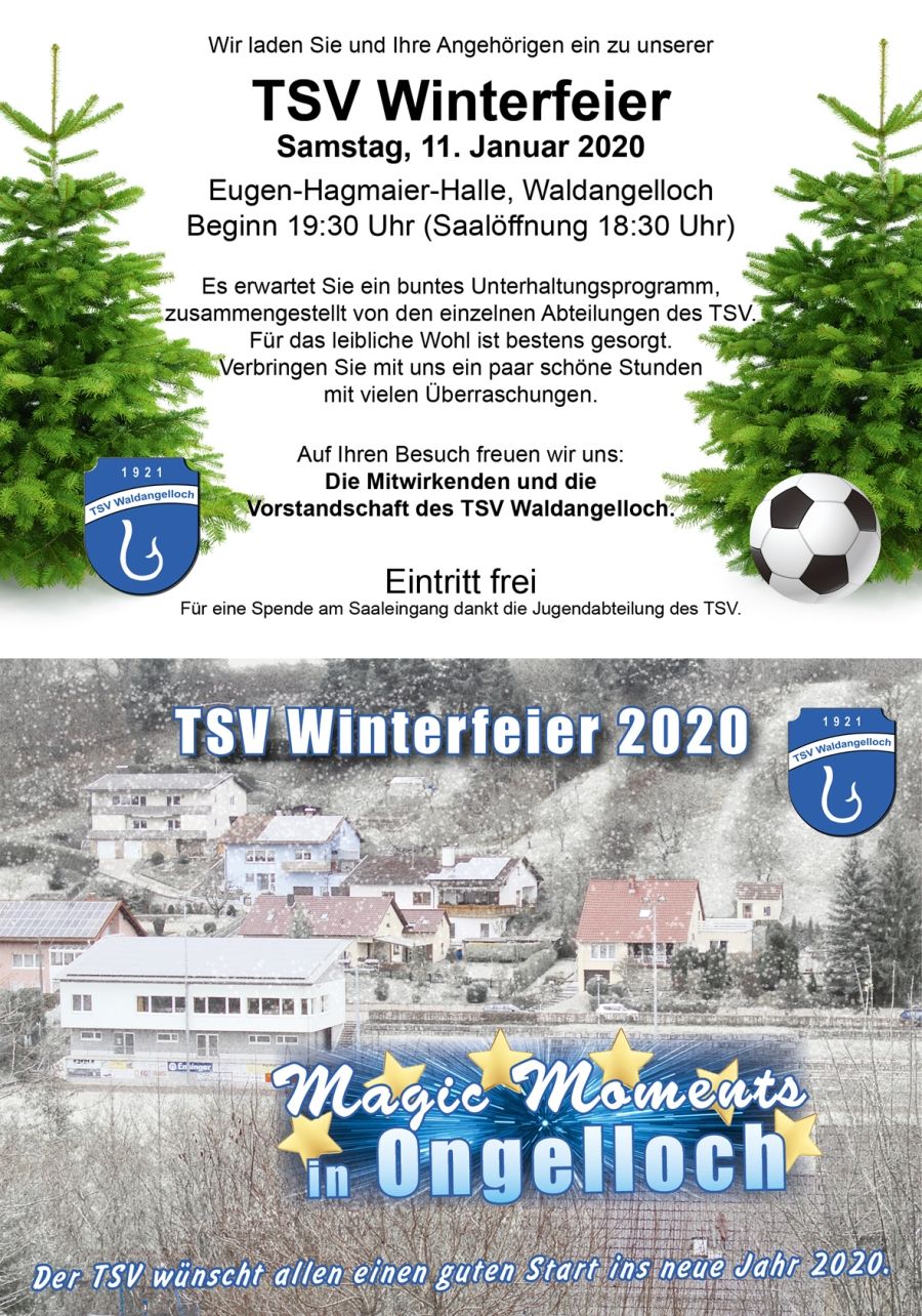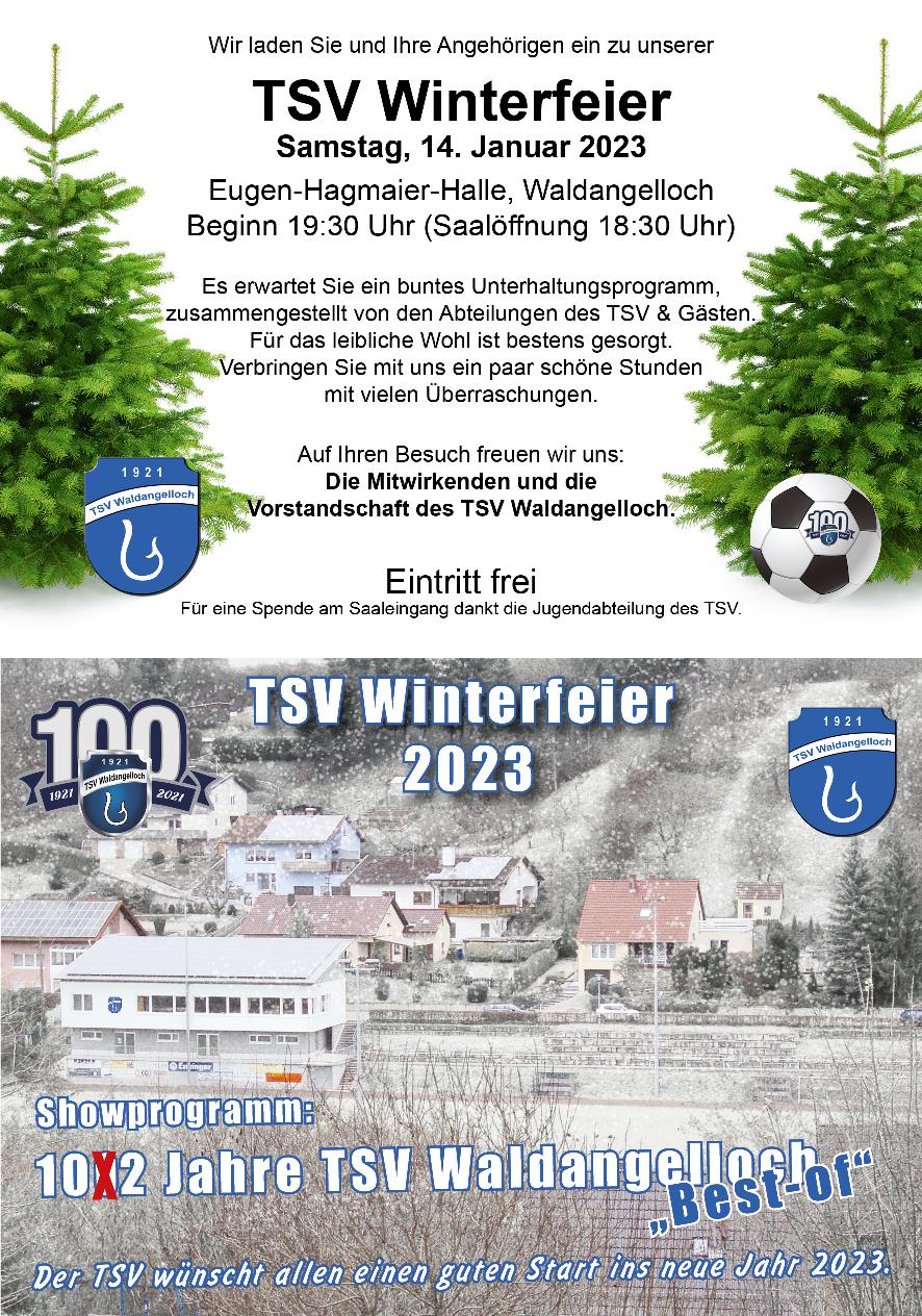 Am Samstag, den 13. Januar 2024 findet die Winterfeier des TSV Waldangelloch in der Eugen-Hagmaier-Halle in Waldangelloch statt. Die Veranstaltung beginnt um 19:30 Uhr....
