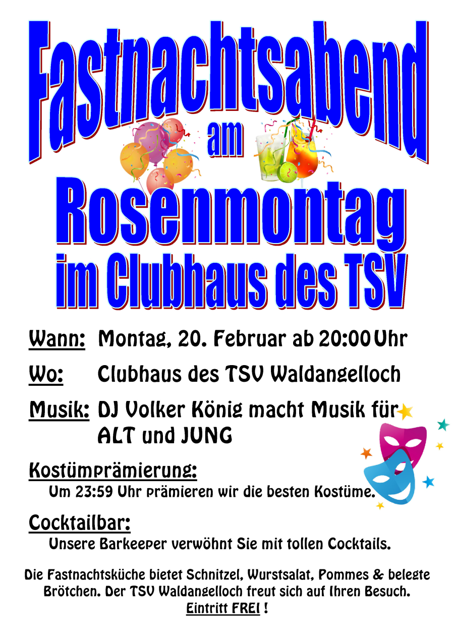 Am Rosenmontag, den 12. Februar ab 20:00 Uhr findet im TSV Clubhaus (Götzenbergstraße 6, 74889 Sinsheim - Waldangelloch) ein Fastnachtsabend statt. Natürlich wird es eine...