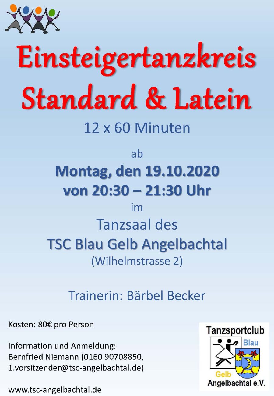 Ein Einsteigertanzkreis startet beim TSC Blau Gelb Angelbachtal am 11. September 2017. An 12 Abenden, immer Montag von 19.00 bis 20.00 Uhr, erlernen die Teilnehmer die...