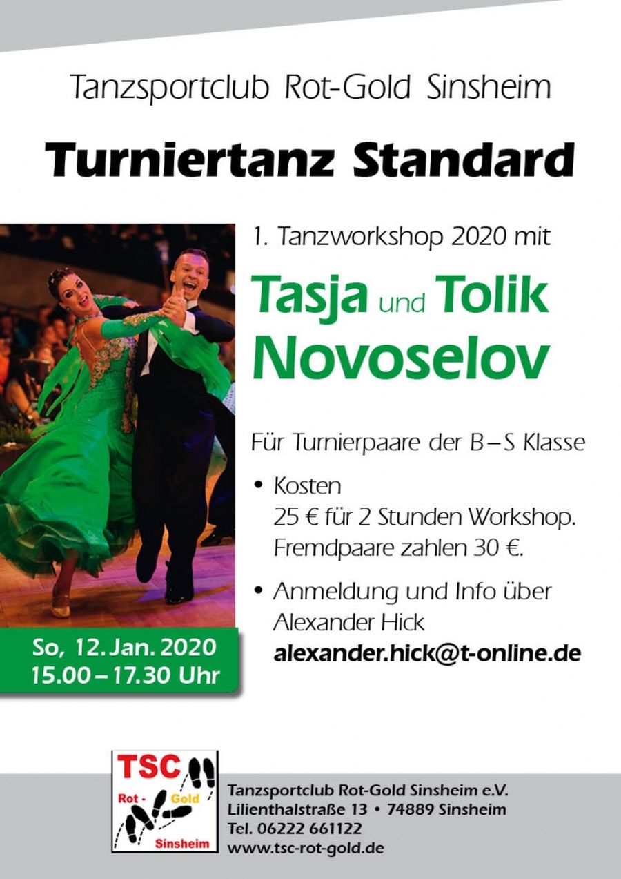 Wieder findet ein Workshop für Standard Turnierpaare im TSC Rot-Gold Sinsheim mit dem Profi-Tanzpaar Anatolyi Novoselov und seiner Frau Tasja Schulz-Novoselov statt. Wer sie...