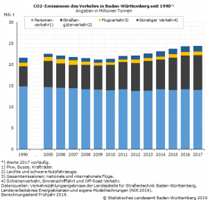 Nach vorläufigen Berechnungen des Statistisches Landesamtes lagen die gesamten Kohlendioxidemissionen (CO2-Emissionen) in Baden-Württemberg im Jahr 2017 bei 71,9 Millionen Tonnen (Mill. t). Davon war gut ein Drittel der Emissionen (ca. 24 Mill. t) verkehrsbedingt. Im Jahr 2017 lagen die verkehrsbedingten CO2-Emissionen mit 2,8 Mill. t immer noch deutlich über dem Referenzjahr 1990. Eine der Ursachen für den Anstieg ist der Straßengüterverkehr (leichte und schwere Nutzfahrzeuge), dessen Emissionen in dem Zeitraum seit 1990 um fast 75 % zunahmen. Demgegenüber sanken die Emissionen des Personenverkehrs (Pkw, Busse, Krafträder) um 6 %. Ein besonders starker Anstieg der CO2-Emissionen 2017 war bei den leichten Nutzfahrzeugen zu verzeichnen. Der stetig wachsende Online-Handel lässt die Emissionen der leichten Nutzfahrzeuge auf unverändert hohem Niveau verharren. Der Güterverkehr ist stark konjunkturabhängig, was sich unmittelbar über die Fahrleistungen und damit den Kraftstoffverbrauch auf den CO2-Ausstoß auswirkt. Die CO2-Emissionen des Flugverkehrs stagnieren seit Jahren. Im Jahr 2017 lag der Anteil des Flugverkehrs an den gesamten verkehrsbedingten CO2-Emissionen in Baden-Württemberg bei 3,4 %. Die Ergebnisse zeigen: Es ist bis jetzt nicht gelungen, das Wirtschaftswachstum und die Verkehrsentwicklung voneinander zu entkoppeln.