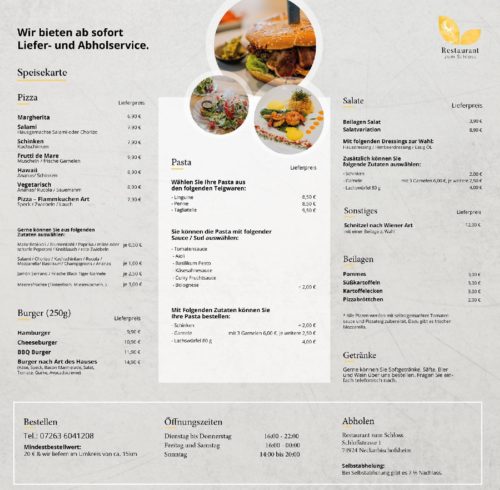 Das Restaurant zum Schloss bietet Lieferung im Umkreis von 15 Kilometern rund um Neckarbischofsheim ab einem Bestellwert von Zwanzig Euro an. Die Speisenkarte sowie Öffnungs- und Lieferzeiten findet man Online auf der Homepage des Restaurants zum Schloss sowie auf der Facebookseite.