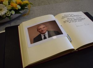 Im Anschluss an die Gesprächsrunde trug sich Thomas Strobl in das Goldene Buch der Stadt Sinsheim ein, bevor er mit Dr. Albrecht Schütte und Jörg Albrecht zu der im Bau befindlichen Klima Arena Sinsheim weiterreiste.