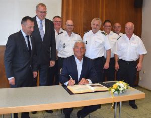 Gemeinsames Gespräch zu aktuellen Herausforderungen der Feuerwehren mit Innenminister Thomas Strobl und Eintrag in das Goldene Buch der Stadt