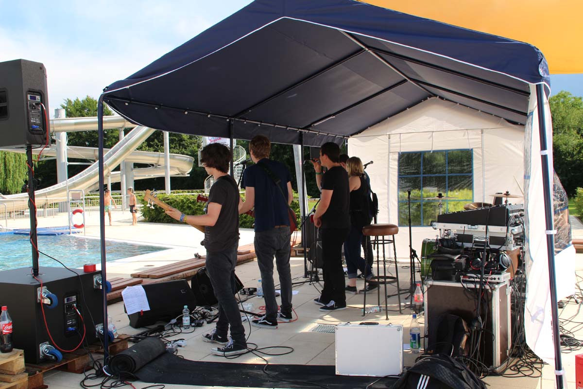 IMG_9399(cr) Schade eigentlich, aber die Freibadfeste und das Wetter sind nicht immer die besten Freunde. Dennoch gibt es immer wieder hartgesottene Freibadgäste die dem schlechten Wetter trotzen. Zum Glück stimmte die Temperatur trotz Regen. Doch zum Live Auftritt von Platin Projekt ging die Sonne auf. Schade das dann trotz des guten Wetters nur wenig hinzukamen. Dies störte die junge Band jedoch überhaupt nicht. Mit ihrer Spiellaune wussten sie ihr Publikum zu begeistern.
