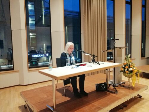Der Höhepunkt des Abends war dann die Lesung von Gabriele von Arnim, die zunächst ihren Vorrednerinnen dankte: „Ich bin beeindruckt. In meinem Alter ist es ungemein beruhigend zu wissen, dass es Menschen gibt, die so etwas bewegen.“ In den Passagen, die sie dann aus ihrem Buch liest, beschreibt sie sehr berührend, wie ihr Mann aus seinem aktiven Leben als bekannter Journalist gerissen wurde. „Er konnte nicht mehr klar sprechen, nicht gehen, lesen oder gar schreiben und war doch die ganze Zeit bei glasklarem Verstand.“ Sie geht den Fragen nach, wie es ist, mit wachem Geist hinter Mauern zu sein oder was man mit dem Gefühl anfängt, ausgeliefert zu sein. Wie man sich selbst verändert und wie man mit Freunden umgeht, die wegbleiben. Der Grat zwischen Fürsorge und Übergriffigkeit sei schmal, sagt von Arnim. Sie greift das nigerianische Sprichwort auf: „Um ein Kind zu erziehen, braucht es ein ganzes Dorf.“ Auch um einen Kranken zu pflegen, brauche es das. Dann erzählt sie, dass sie eine Gruppe von Vorlesern für ihren Mann engagiert habe. Am Ende seien es 17 gewesen, die ihm Tageszeitungen oder Romane vorgelesen hätten. Er habe das geliebt und jeden Morgen gefragt: „Wer kommt heute?“ Für die Vorleser wiederum wäre so die Kontaktaufnahme einfacher gewesen als wenn sie lediglich Besucher gewesen wären. Sie hätten eine Funktion gehabt und auf diese Weise lernen können, mit einem Kranken umzugehen.