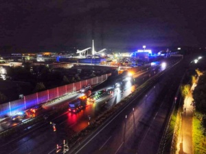 Bevor U17 auf das Gelände des Technik Museum Sinsheim rollte, galt es noch eine Hürde zu nehmen: die Autobahn zu überqueren. In der Nacht zum Sonntag, 28. Juli, war die A6 zwischen den Anschlussstellen Sinsheim und Sinsheim-Steinsfurt ab 00:00 Uhr in beiden Fahrtrichtungen voll gesperrt. 15 Minuten später fuhr der Transport auf die Autobahn in Richtung Heilbronn auf, wechselte nach wenigen Metern die Fahrtrichtung und nahm anschließend die Ausfahrt „Sinsheim Süd“. Nach erfolgreicher Überquerung wurde der Tieflader mit dem U-Boot gegen 02:30 Uhr auf der Dietmar-Hopp-Straße kurz vor der Neulandstraße abgestellt.