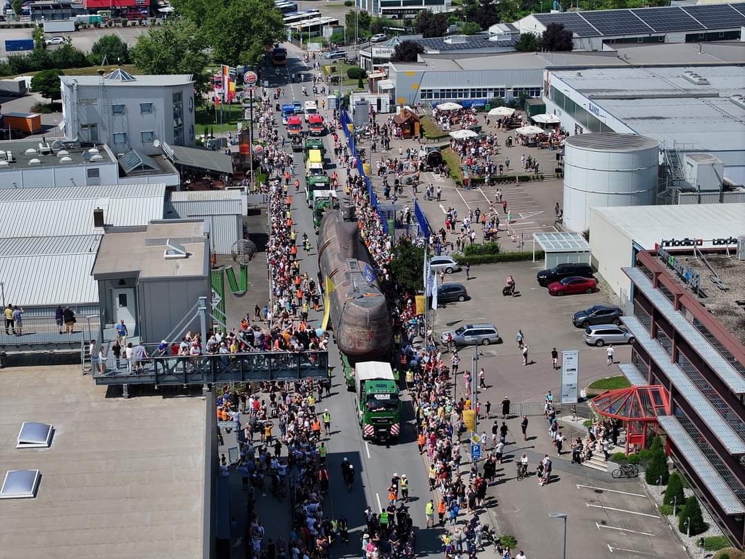 Auf dem Wasser, der Straße, geneigt und wiederaufgerichtet, durch enge Ortschaften, über Bahngleise und Autobahn und durch die Serpentinen des Kraichgaus – nach vierwöchiger Reise hat U17 sein finales Ziel erreicht. Am Sonntag, 28. Juli 2024, wurde das U-Boot der Klasse 206A mit einer feierlichen Zeremonie auf dem Gelände des Technik Museum Sinsheim willkommen geheißen. Das eindrucksvolle maritime Exponat ist nun ein Highlight der Ausstellung und wurde von zahlreichen Gästen und Ehrengästen gebührend empfangen.