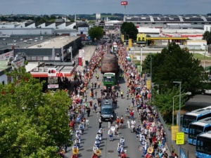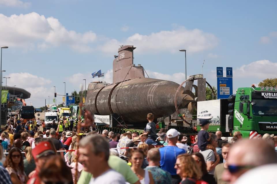 Wenige Stunden später machte sich das Transportteam bereit für den letzten Kilometer. Um elf Uhr setzte sich der Tross in Richtung Technik Museum Sinsheim in Bewegung. Die Musikkapellen SFZ Big Band Waibstadt und SFZ-Musikzug 1951 Meckesheim marschierten voran und gaben den (Transport-)Takt vor. Tausende Schaulustige säumten die Neulandstraße, um U17 auf dem letzten Stück bis zum Ziel zu begleiten. Entlang der Strecke gab es ein buntes Programm: Örtliche Vereine, Organisationen und Firmen bewirteten die Massen mit Imbissständen und Foodtrucks. Für die kleinen U-Boot-Fans gab es Hüpfburgen, Malstationen und Kinderschminken.