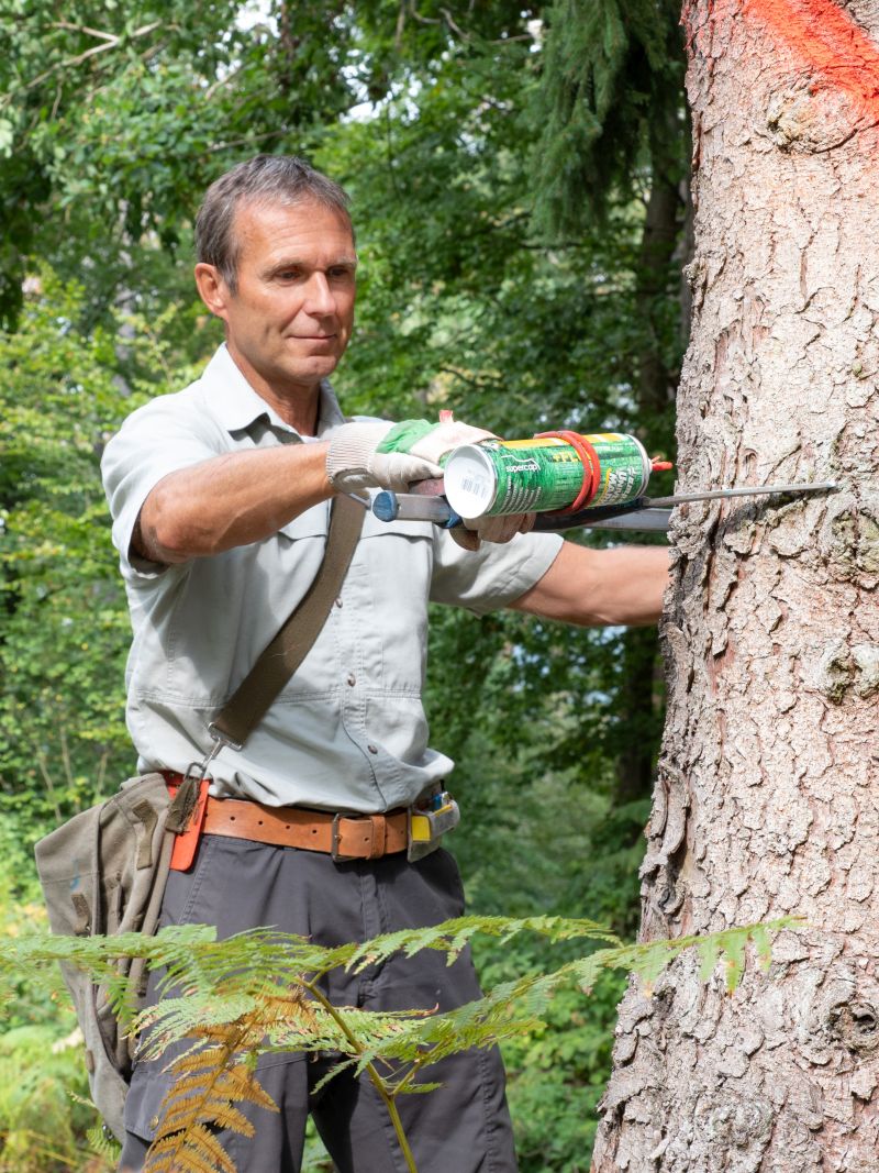 Welche waldbaulichen Konzepte für die nächsten hundert Jahre tragfähig sind und welche Baumarten mit den Folgen des Klimawandels zurechtkommen wer-den, kann die Forstwissenschaft im Moment nicht mit letzter Sicherheit sagen. „Daher liegt unser Hauptaugenmerk bei der Waldpflege auf der Streuung des Risikos. Wir versuchen, viele verschiedene Baumarten auf verschiedenen Böden anzupflanzen – wenn wir überhaupt pflanzen. Wo immer möglich setzen wir auf die natürliche Regenerationsfähigkeit des Waldes und arbeiten mit frei ausgesamten jungen Bäumen.“ so der engagierte Förster. Den Wald angesichts der Schädigungen sich selbst zu überlassen ist für Reinhard keine tragfähige Lösung: „Die Trockenheit der letzten Jahre hat so starke Auswirkungen und verändert die Umwelt so schnell, dass sich das Ökosystem Wald nicht mit ausreichender Geschwindigkeit anpassen kann.“