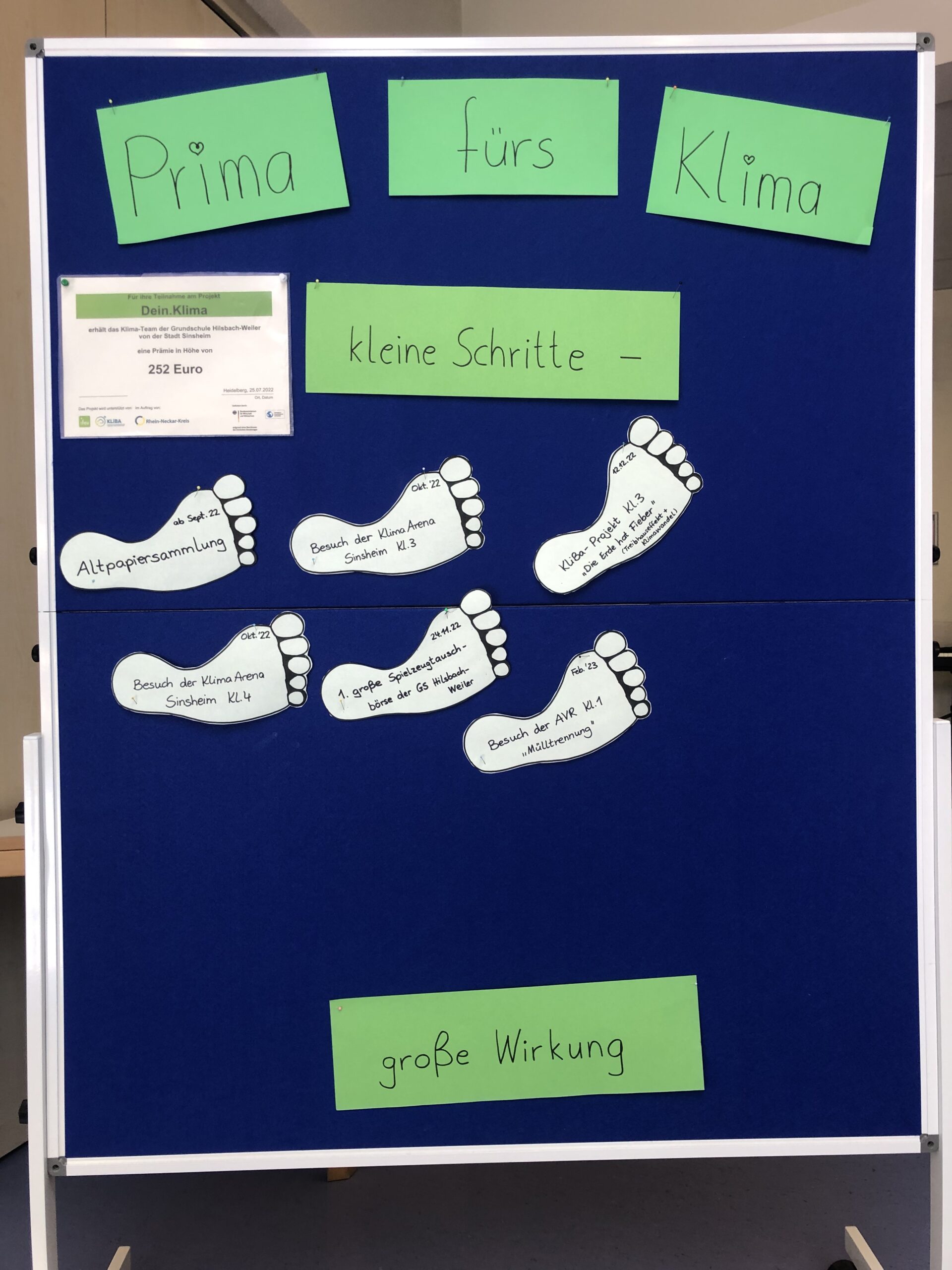 Alle Aktionen der Schule werden in der Aula gut sichtbar auf einem Aufsteller festgehalten und immer wieder klassenintern oder auf schulinternen Versammlungen thematisiert.