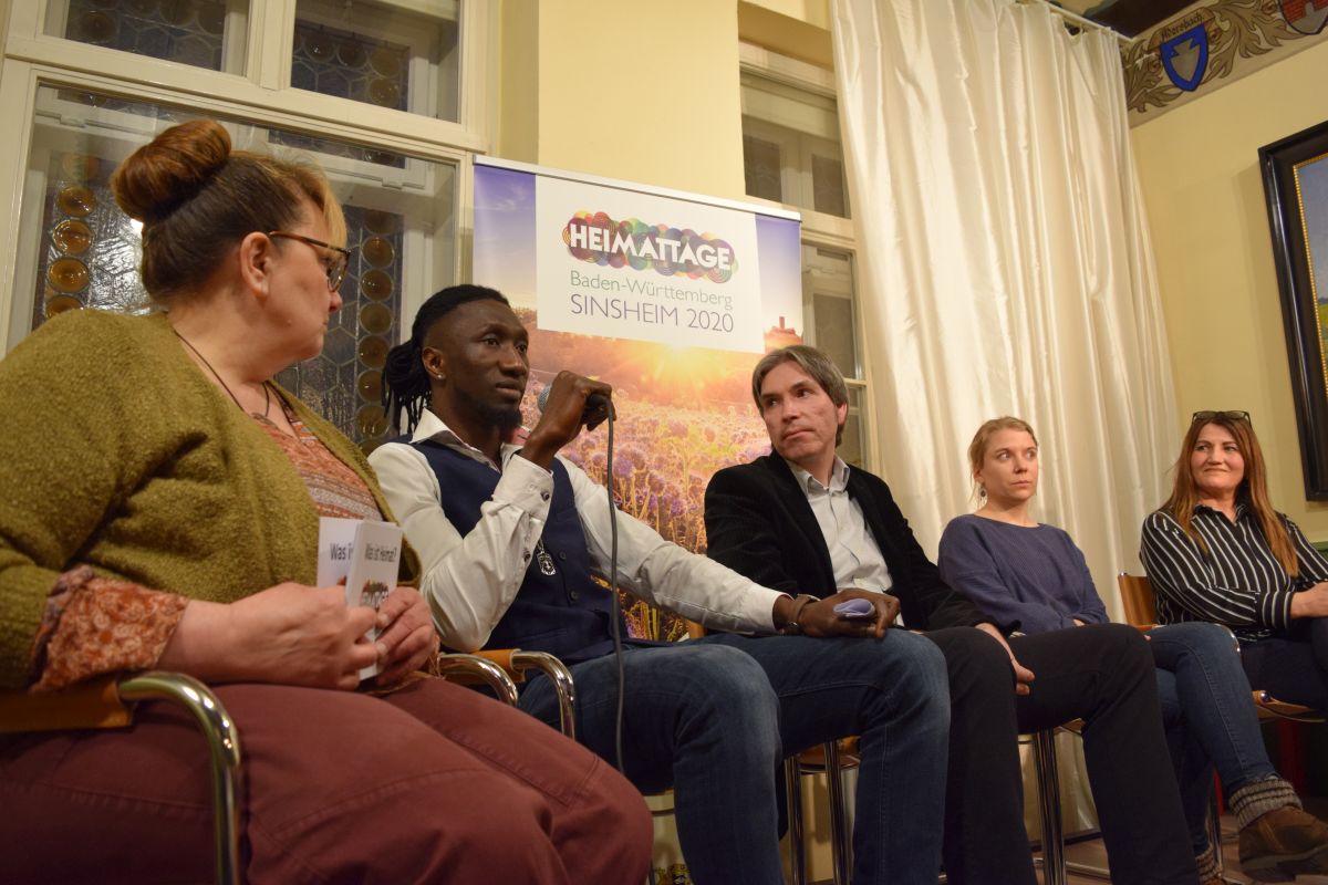 Als Urgestein konnte Peter Hesch so manche Anekdote aus Sinsheim erzählen. Er liebt jeden Winkel und wusste nach 5-jährigem Exil in Baiersbronn noch mehr, dass er Sinsheim nie wieder den Rücken kehren wollte. Als Zuwanderin der 2. Generation berichtete Asiye Ersoy, wie ihr Vater von 1969 immer wieder seine Gastarbeiteranstellung verlängerte, bis er 1981 die ganze Familie aus der Türkei nach Sinsheim holte. Sie habe zwei Heimaten und erzählte lachend, dass sie sogar zweisprachig träumt: auf Deutsch und Türkisch. „Ich bin ein Sinsheimer“ sagt auch Jamil Fafa Ceesay nach fast vier Jahren als jüngster Neu-Sinsheimer in der Runde. Nach einer abenteuerlichen Reise beginnend in Gambia und dem Senegal, ist für ihn Heimat vor allem das Gefühl, zuhause zu sein. Seine ersten Gerichte als angehender Koch waren Spätzle und Kartoffelsalat – auch das ist Heimat!