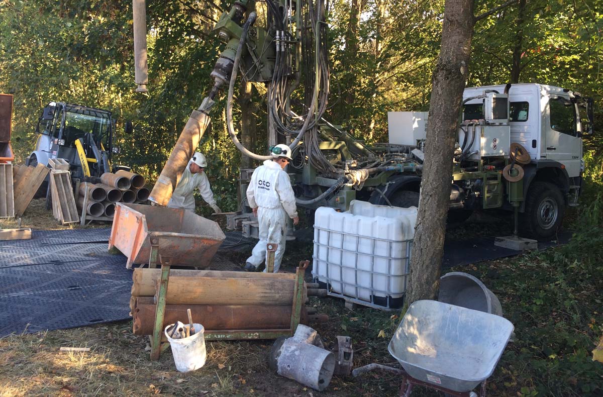 Die Bohrarbeiten dauern etwa drei Wochen. Gebohrt wird mit einem Bohrfahr-zeug mit 9 m hohem Bohrturm. Unter günstigen Voraussetzungen können im Festgestein bis zu 15 m pro Tag gebohrt werden. Weil aber größte Sorgfalt erforderlich ist, um den Untergrund richtig zu beurteilen und keine weiteren Umweltschäden zu verursachen, muss schrittweise vorgegangen werden. So kommt es immer wieder zu Zwangspausen.