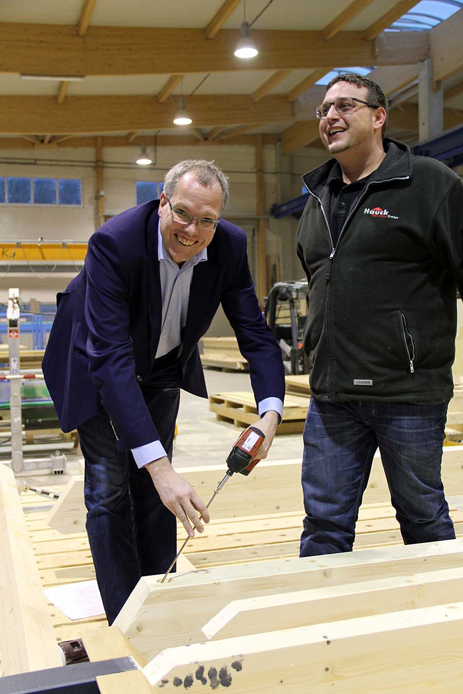 (zg) Neckarbischofsheim. Am Dienstagabend besuchte der CDU-Landtagskandidat Dr. Albrecht Schütte die Firma Hauck Holzbau GmbH, um sich vor Ort ein Bild des Familienunternehmens zu machen. Zunächst führte Sebastian Hauck den Landtagskandidaten durch die Produktionshallen des Unternehmens und erläuterte die verschiedenen Planungs- und Fertigungsschritte. „Wir bauen keine Fertighäuser – wir legen Wert auf die Erfüllung individueller Wünsche unserer Kunden. Der Bauherr kann mit anpacken und das Haus quasi mit seinen eigenen Händen bauen – das ist wie Lego für Erwachsene“, erklärte Hauck im Gespräch. Ob Neubau oder eine Modernisierung – alles sei machbar.