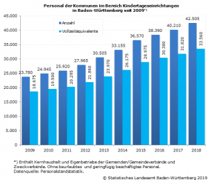 Den größten personellen Anstieg verzeichnete der kommunale Bereich mit einem Zuwachs von 5 625 Personen, das waren zum 30. Juni 2018 2,3 % mehr als im Vorjahr. Dabei machten die Beschäftigten im kommunalen Bereich rund 42 % des gesamten öffentlichen Dienstes aus. Der Anteil der Frauen im kommunalen Bereich beträgt mit 159 195 knapp 66 % und ist somit größer als im Landesbereich. Im Aufgabenbereich der Hauptverwaltung stieg die Zahl der Beschäftigten mit 3 895 um 9,6 %. Zudem kam es in den Tageseinrichtungen für Kinder bis zu 6 Jahren wie im Vorjahr zu einem starken Zuwachs an Personal. Die Zahl der in diesem Bereich Beschäftigten stieg auf 42 420, das sind 2 300 oder 5,4 % mehr als im Jahr zuvor.