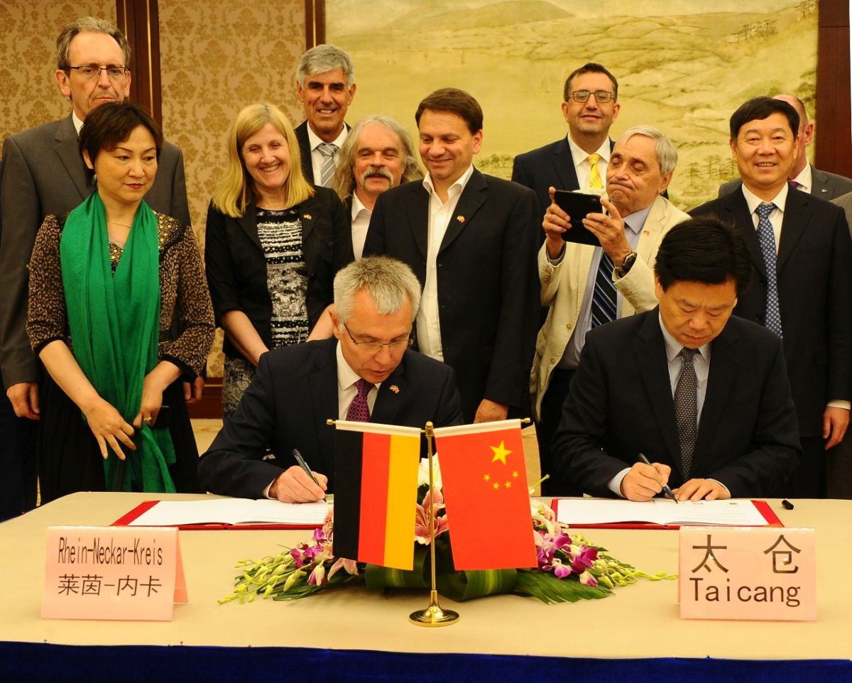 (zg) Die chinesische Stadt Taicang und der Rhein-Neckar-Kreis werden zukünftig im Rahmen einer kommunalen Partnerschaft zusammenarbeiten. Eine entsprechende Vereinbarung wurde am 29. Mai 2019 bei einer Delegationsreise nach Taicang von Landrat Stefan Dallinger und Jianguo Wang, Oberbürgermeister von Taicang, unterzeichnet. An der Delegationsreise vom 28. Mai bis 2. Juni hatten neben Landrat Dallinger auch die Vorsitzenden der Kreistagsfraktionen Bruno Sauerzapf (CDU), Dr. Ralf Göck (SPD), Hans Zellner (Freie Wähler), Ralf Frühwirt (Bündnis 90/Die Grünen), Claudia Felden (FDP) und Dr. Edgar Wunder (Die Linke) teilgenommen.