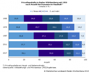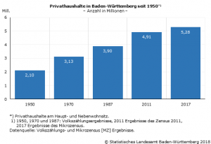 Nach dem aktuellen Mikrozensus lebten 2017 knapp 5,3 Millionen (Mill.) Haushalte mit Haupt- oder Nebenwohnsitz in Baden-Württemberg. Das sind über 2,5-mal so viele als im Jahr 1950 stellt das Statistische Landesamt fest. Die 1950 durchgeführte Volkszählung ermittelte 2,1 Mill. Haushalte. Die Zahl der Einwohner Baden-Württembergs hat im gleichen Zeitraum lediglich um knapp 70 % zugenommen. Die Zahl der Haushalte stieg deutlich stärker als die Einwohnerzahl, da die Haushaltsgrößen stark zurückgegangen sind.