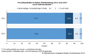 Damit lebten 2017 nur noch in gut jedem fünften Haushalt (21,1 %) in Baden-Württemberg ledige minderjährige Kinder. Das sind 1,5 Prozentpunkte weniger als noch 2011. In rund 537 000 Haushalte lebte 2017 ein Kind, in 437 000 zwei Kinder und in 140 000 Haushalten drei und mehr Kinder.