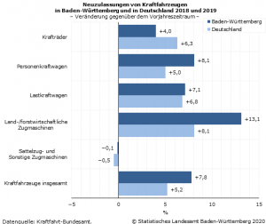 Die Zahl der neu zugelassenen1 Kraftfahrzeuge (Kfz) stieg nach Angaben des Statistischen Landesamtes Baden-Württemberg im Jahr 2019 auf 596 284 Kfz, das sind deutliche 7,8 % mehr Neuzulassungen als im Vorjahr. Nach den Ergebnissen der Fahrzeugstatistik des Kraftfahrt-Bundesamtes entfielen davon 87,0 % auf Personenkraftwagen (Pkw). Die Zahl der erstmalig zugelassenen Pkw stieg 2019 um 8,1 % auf 518 851 Pkw an (+38 756 Pkw). Zum Vergleich: Im Bundesdurchschnitt erhöhten sich die registrierten Kfz-Neuzulassungen 2019 gegenüber dem Vorjahr lediglich um 5,2 %, die Pkw-Neuzulassungen stiegen um 5,0 %.