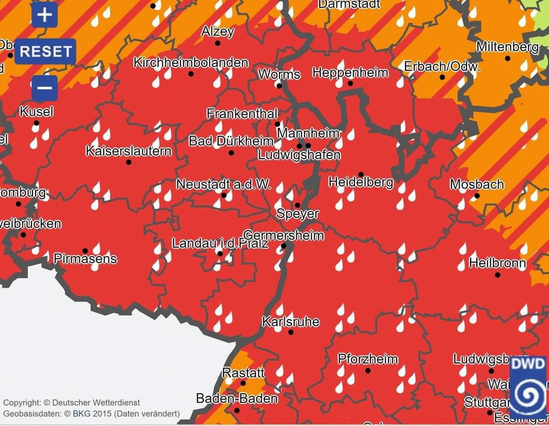 Die Warnung gilt für: Kreis Bergstraße, Stadt Mannheim, Stadt Heidelberg, Rhein-Neckar-Kreis, Neckar-Odenwald-Kreis, Stadt Worms, Stadt Ludwigshafen, Stadt Neustadt, Stadt Frankenthal, Stadt Landau, Stadt Speyer, Kreis Germersheim, Kreis Bad Dürkheim, Rhein-Pfalz-Kreis, Kreis Südliche Weinstraße