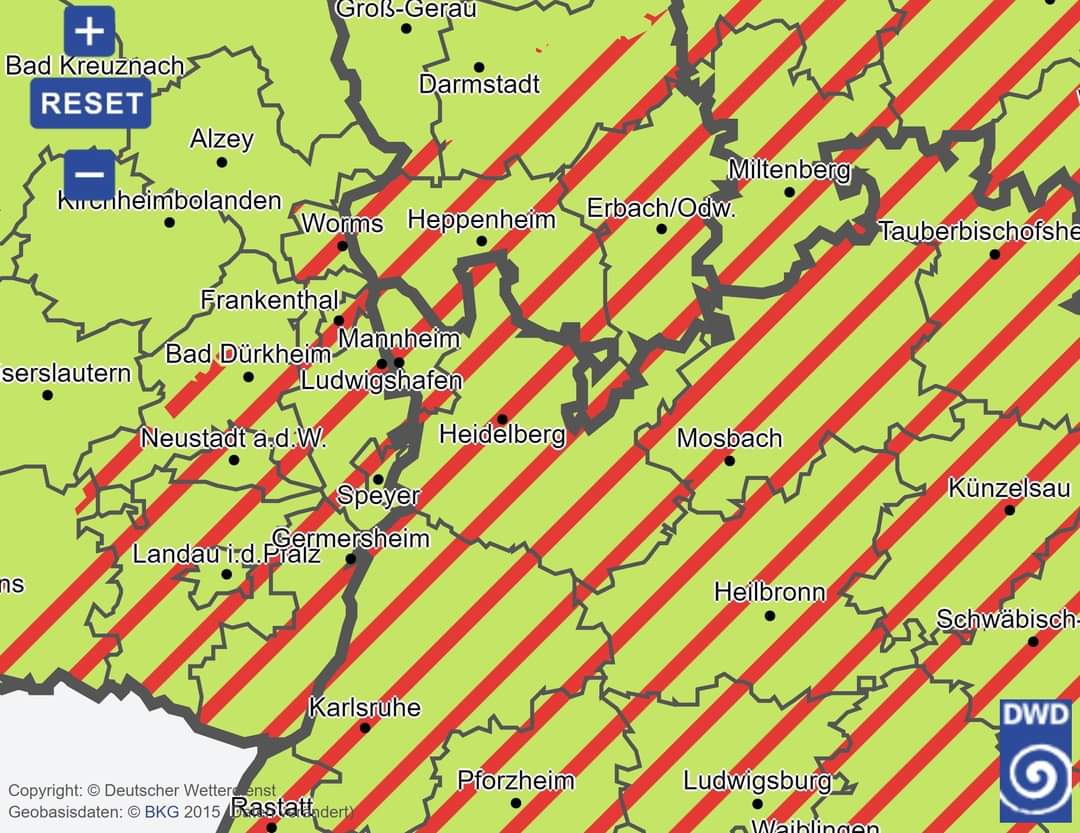 Dies ist ein Hinweis auf eine Wetterlage mit hohem Unwetterpotential. Er soll die rechtzeitige Vorbereitung von Schutzmaßnahmen ermöglichen. Gewitter mit den genannten Begleiterscheinungen treten typischerweise sehr lokal auf und treffen mit voller Intensität meist nur wenige Orte.