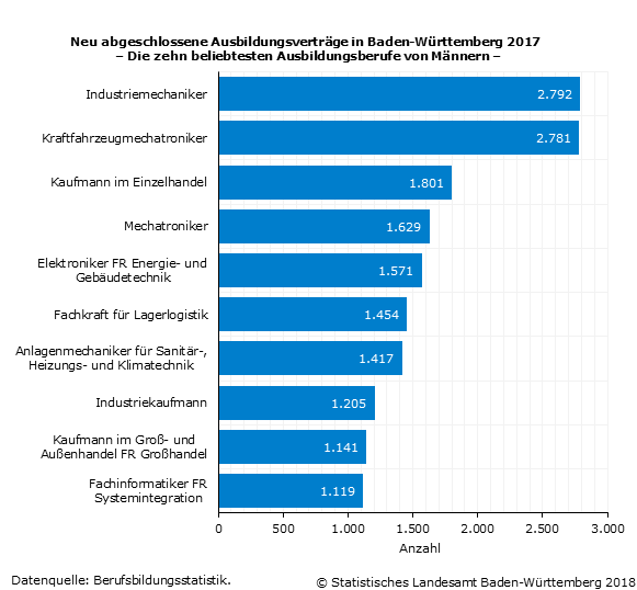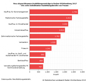Im Jahr 2017 wurden in Baden-Württemberg 74 066 Ausbildungsverträge neu abgeschlossen, davon 61 % von Männern (45 543) und 39 % von Frauen (28 523). Wie die Auswertung des Statistischen Landesamts zur Berufsbildungsstatistik weiter ergab, bedeutet dies einen leichten Zuwachs von 0,5 % im Vergleich zum Vorjahr.