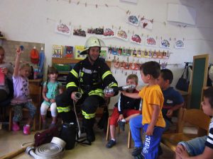 (zg) Durch eine demokratische Abstimmung, hatten sich die Kinder der Seepferdchengruppe entschieden, mehr über und rundum die Feuerwehr zu erfahren. Zuerst wurden viele Bücher angeschaut, Informationen ausgetauscht und mit Feuerwehrautos und Utensilien gespielt. Danach konnten wir als krönenden Abschluss Herrn Piot von der freiwilligen Feuerwehr Neckarbischofsheim dafür gewinnen, unseren Kindern aus erster Hand zu zeigen und zu erklären was ein Feuerwehrmann so macht und welche Geräte er braucht. Herr Piot kam zu uns in die Gruppe – wohlgemerkt in voller Montur und mit vielen Ausrüstungsgegenständen (Spritze , Schlauch ,Handy, Spitzhacke usw.). Herr Piot staunte, wieviel unsere Kinder schon über Feuer und die Feuerwehr wußten; angefangen von der Notrufnummer 112, über die Aufgaben der Feuerwehr bishin zur Brandbekämpfung . Dann erklärte Herr Piot den Kindern die Ausrüstung eines Feuerwehrmanns ,beantwortete ihre Fragen und verriet uns noch, dass die Kinder schon ab 10 Jahren bei der Feuerwehr mitmachen können. Zum Schluss fuhr Herr Piot mit einem Feuerwehrwagen davon und verabschiedete sich zur Begeisterung unserer Kinder mit einem kurzen Sirenengruß. Vielen Dank für den Besuch , die kompetente Beratung der Kinder und einen sehr interessanten Vormittag Herr Piot!