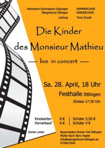 Der Kinderchor des Sängerbundes Ittlingen und der Kammerchor des Hartmanni-Gymnasium Eppingen unter der Leitung von Timo Ducati stellt sich der Herausforderung, diese anspruchsvollen Lieder im Original mit Klavierbegleitung und Solisten parallel zum Filmgeschehen aufzuführen.