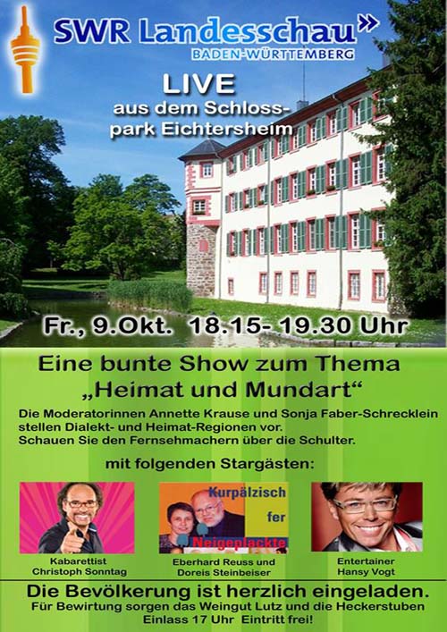 Die SWR Landesschau Baden-Württemberg sendet am 9. Oktober 2015 eine Extra-Ausgabe live vom Wasserschloss Eichtersheim in Angelbachtal. Von 18.15 bis 19.30 Uhr dreht sich alles um das Thema „Heimat und Mundart“ im Rahmen der ARD-Themenwoche „Heimat“.