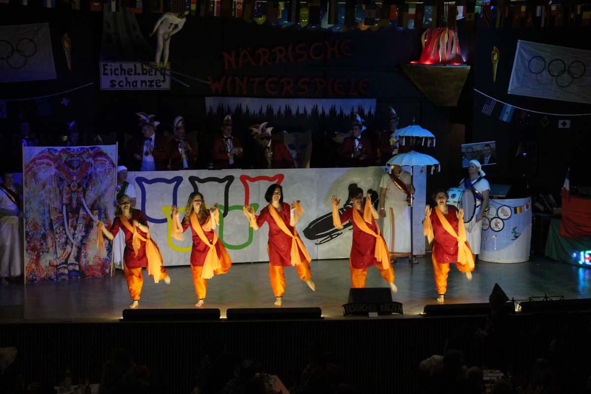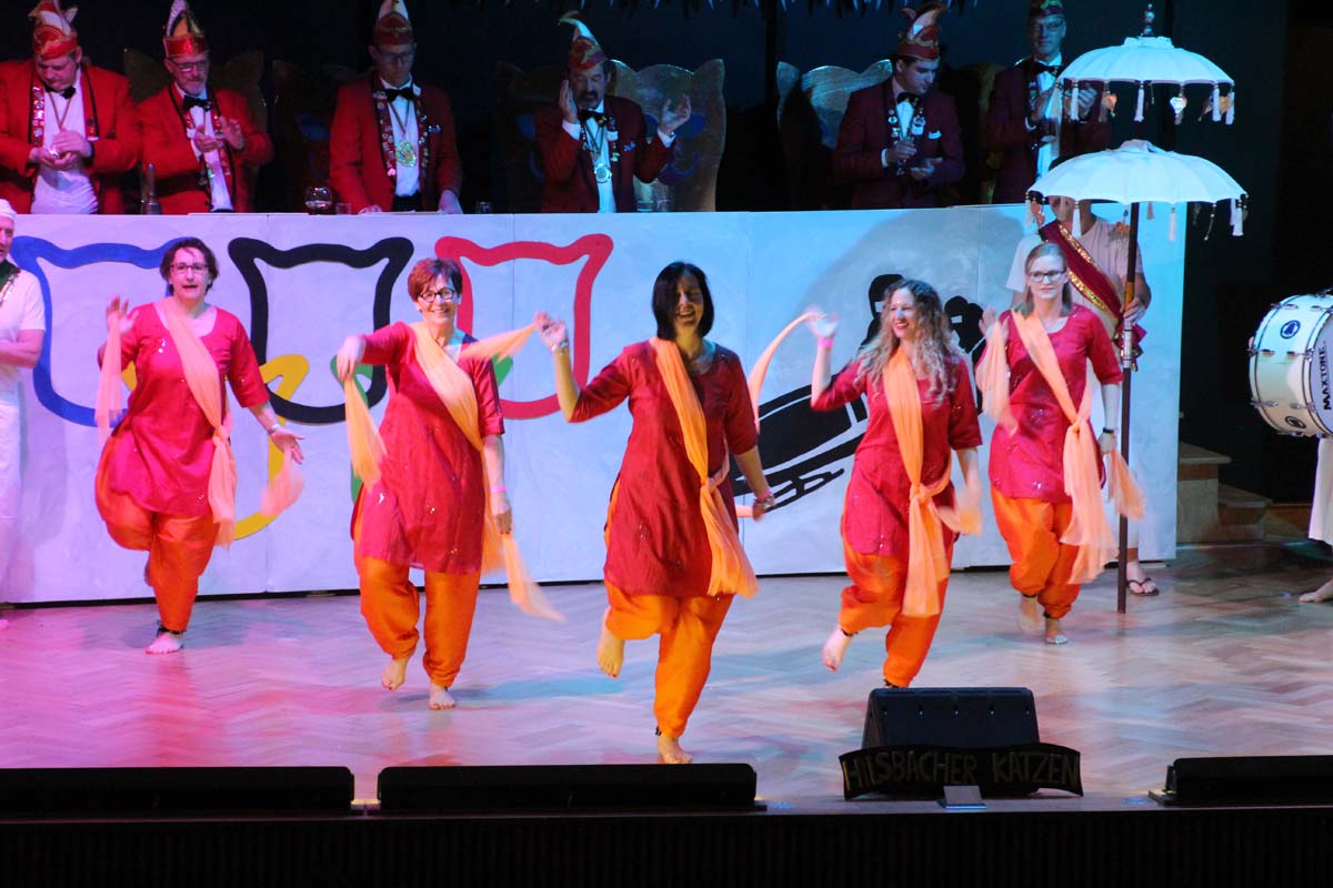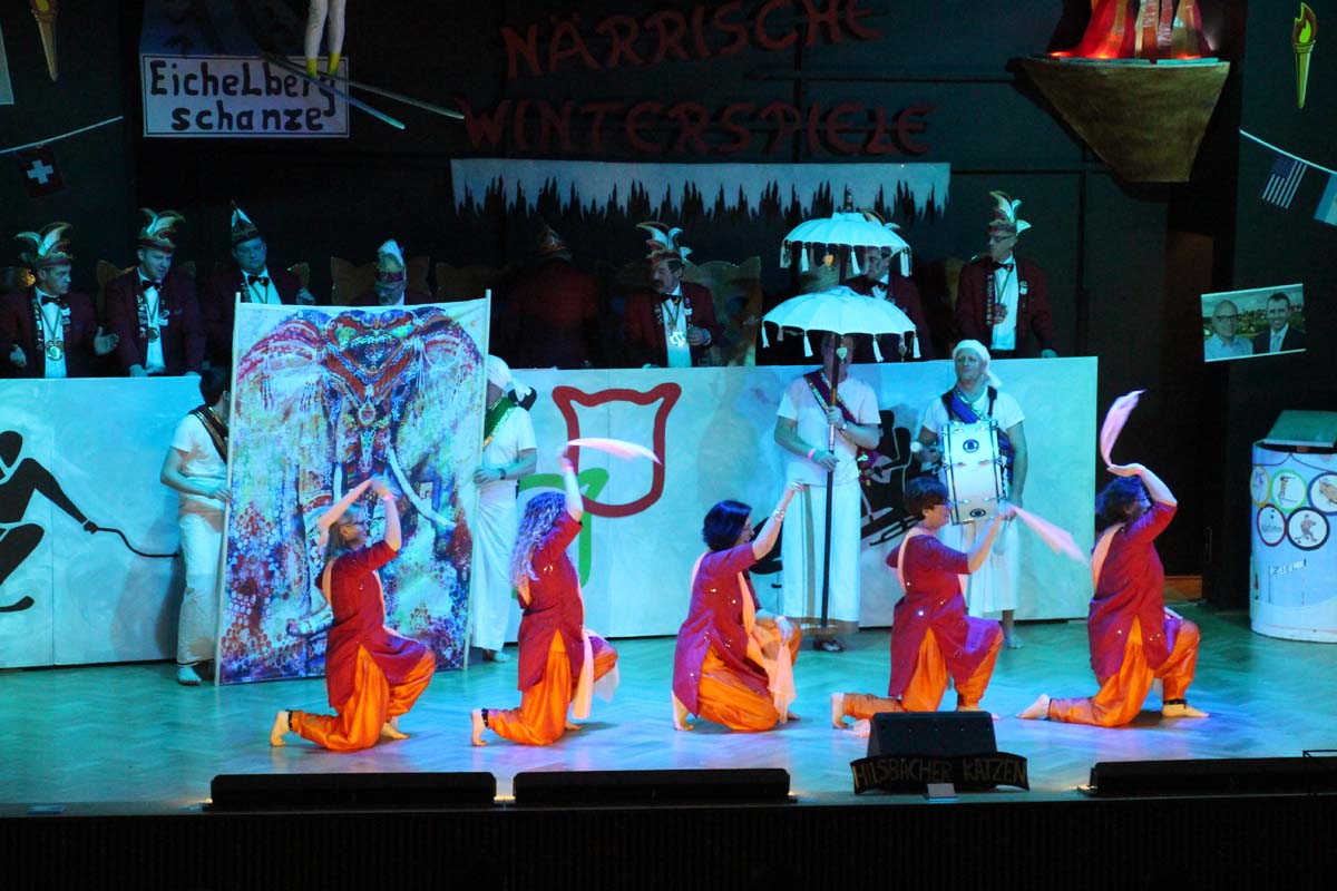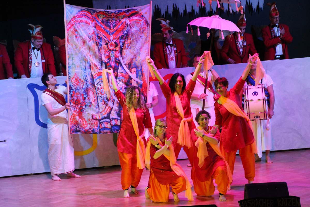 Auch schon zum alljährlichen Programm gehört das Duo Albrecht/Spranz. Mit dem Song über Tante Anna zeigte unser OB Jörg Albrecht das er auch gesangliche Qualitäten besitzt. Indischen Tanz zeigte die Tanzgruppe der katholischen Kirche und auch Dekan Hafner übernahm hier gerne eine Statistenrolle. Dann durfte die Mittlere Garde ihr können auf der Bühne zeigen. Sicher und synchron schwangen ihre Beine über die Bühne.