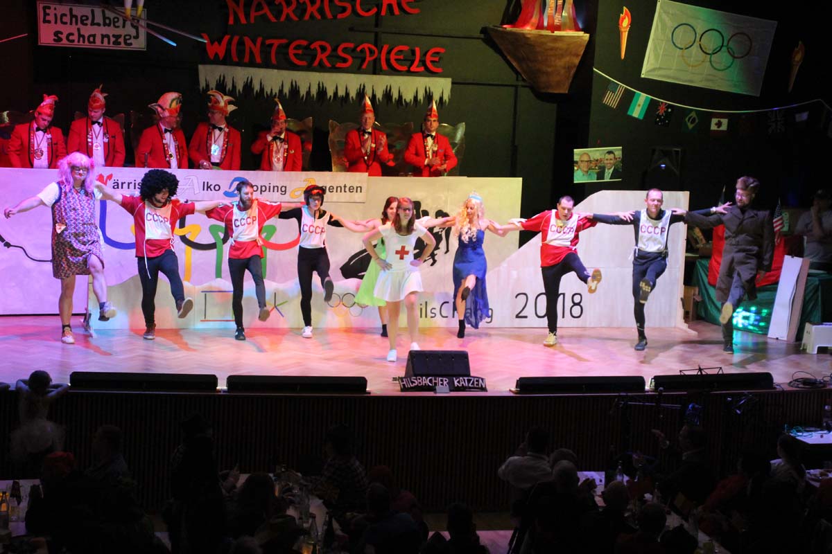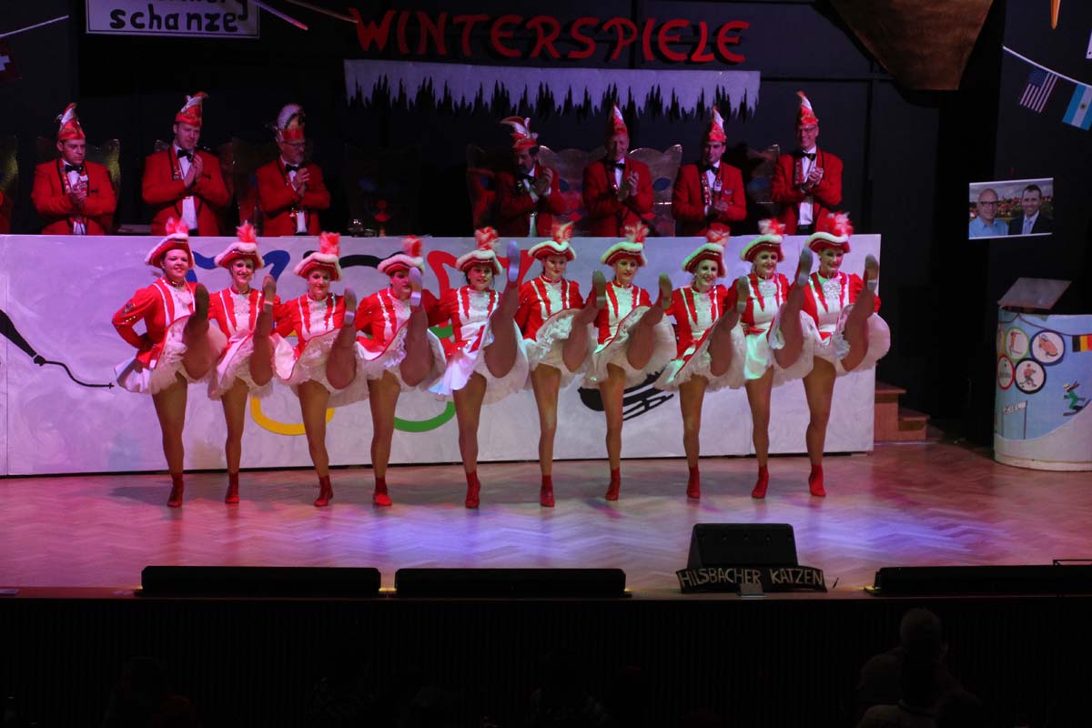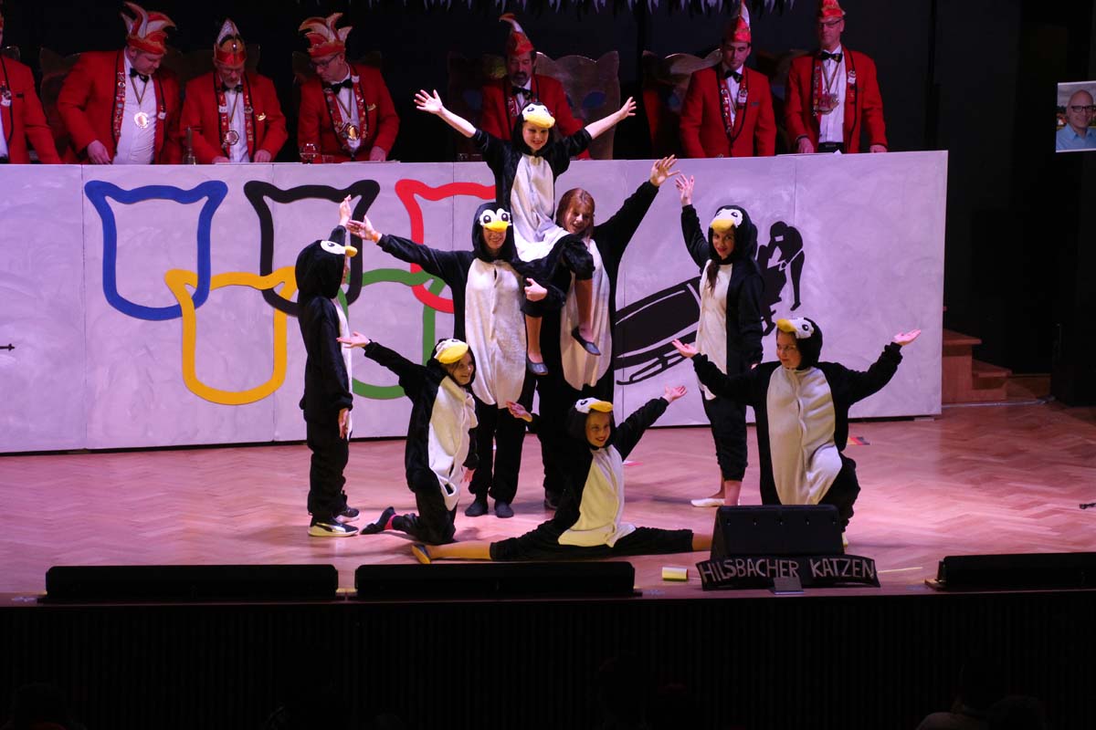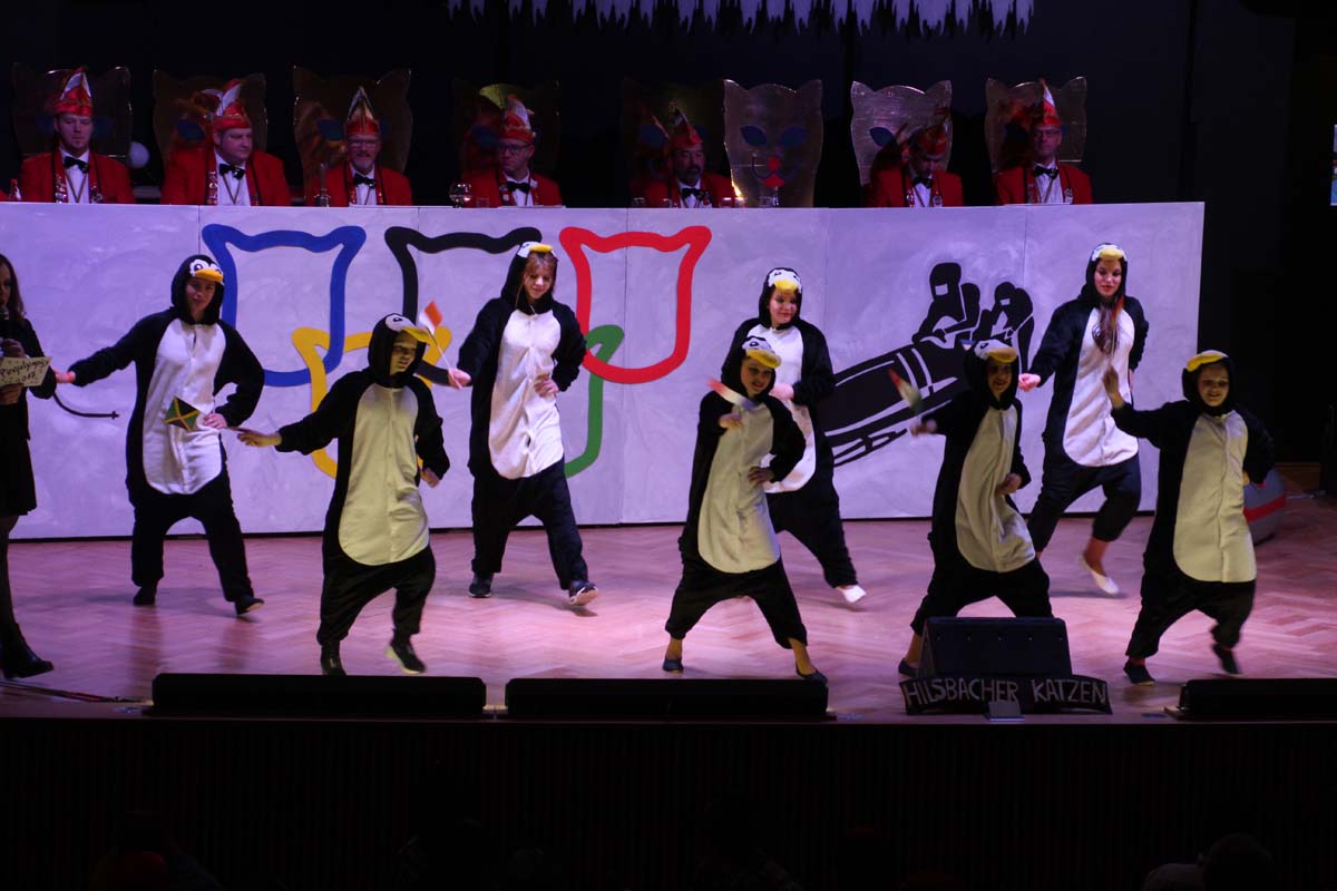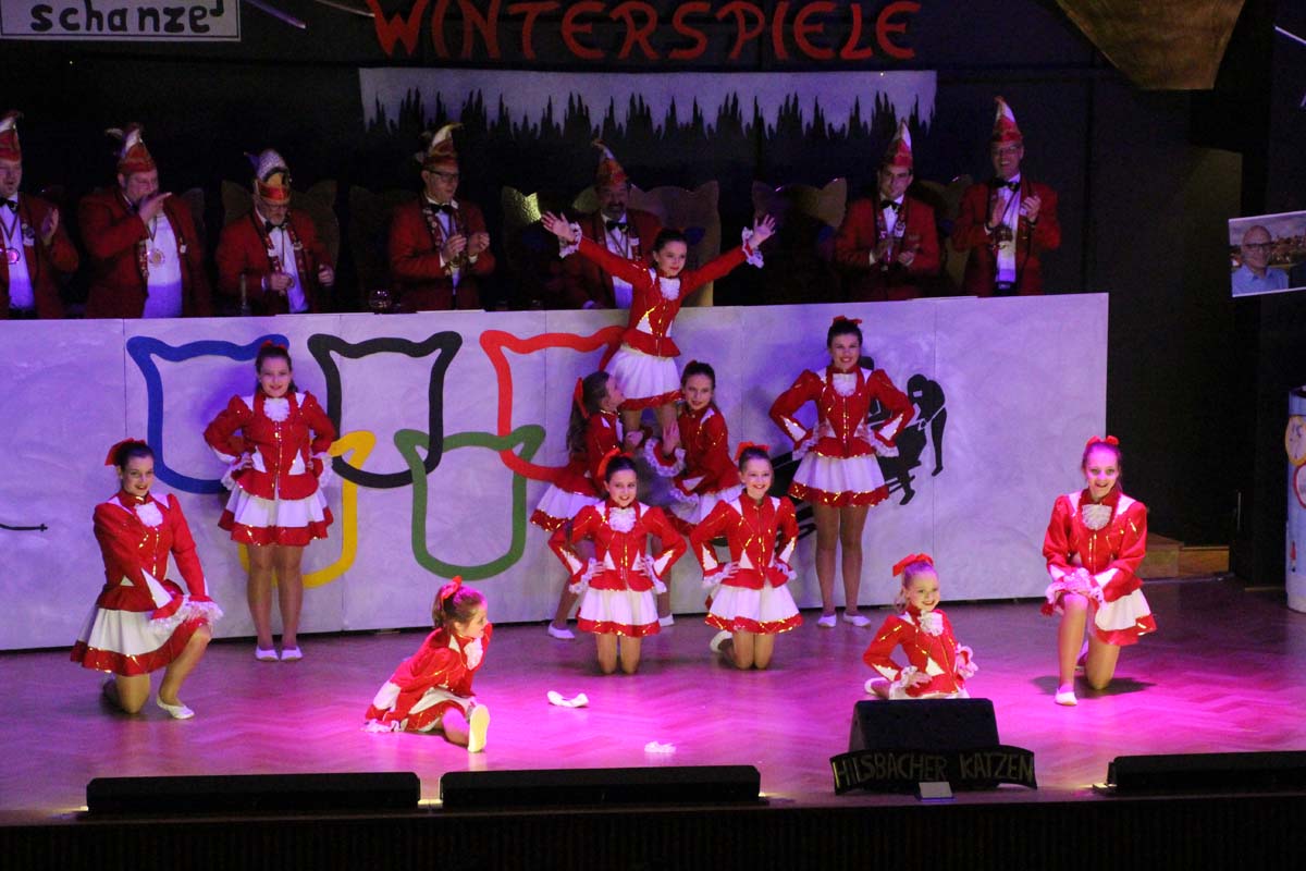 Feierlich wurde die Veranstaltung mit einer Fackel das närrisch olymische Feuer entzündet. Dann standen auch schon 116 Akteure bereit das ausverkaufte närrische Haus zu unterhalten. Bereits der Einmarsch auf die Bühne zeigte ein herrliches Bild. Und dann ging auch schon die Post ab. Die tanzenden Pfötchen, die jüngste Truppe der Hilsbacher Katzen, tanzten sich mit Frosty the Snowman und Ice Baby nicht nur in die Herzen ihrer Eltern, sondern verzauberten auch das Publikum mit ihrer tollen Show. Was wäre der Hilsbacher Fasching ohne eine närrische Bütt über das vergangene Dorfgeschehen. Katz und Katz hatten da so einiges zu erzählen und auch auch OV und OB mussten sich so einiges sagen lassen. Gute Nachwuchsarbeit zeigte sich bei der neuen Kleine Garde. Den Applaus für ihre tolle Leistung hatten sie sich redlich verdient.