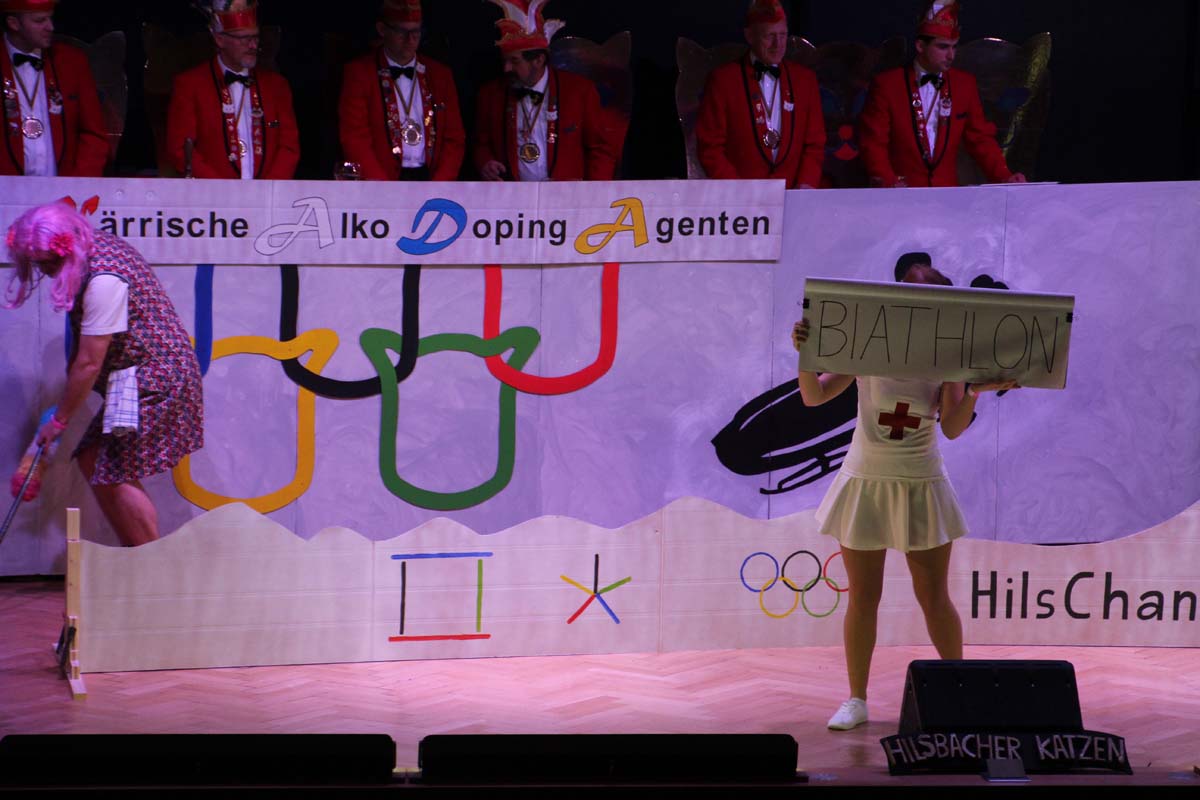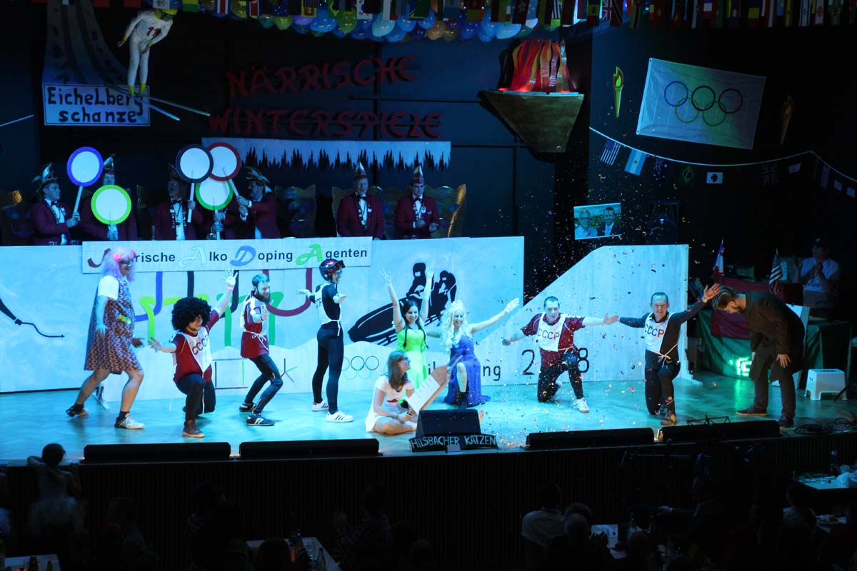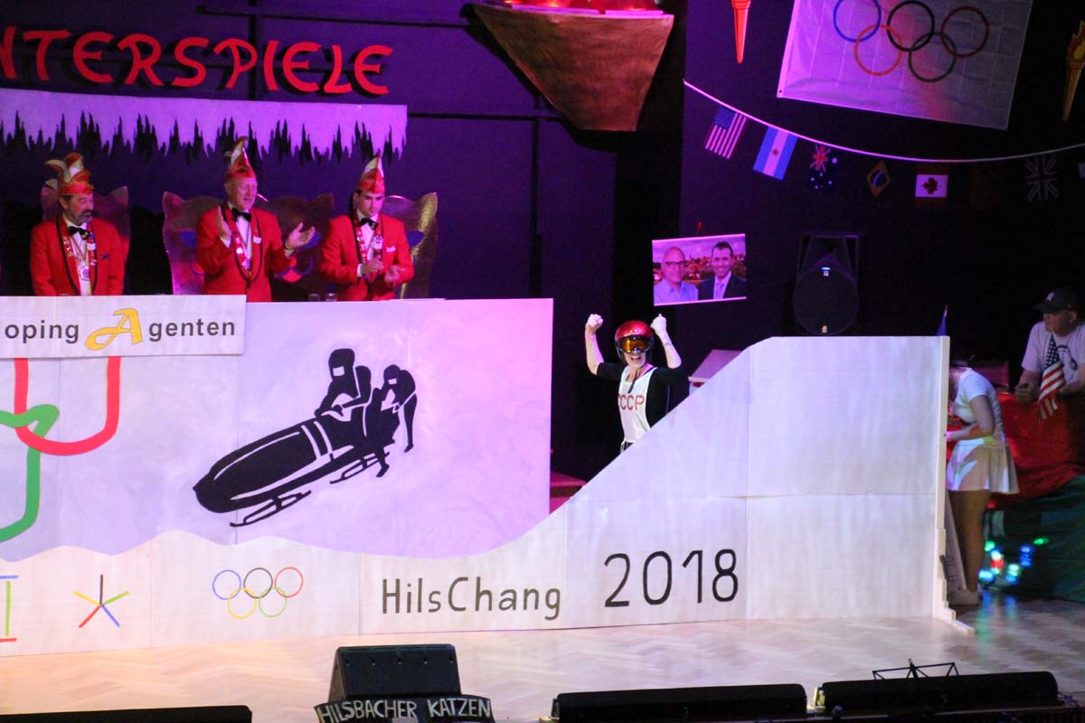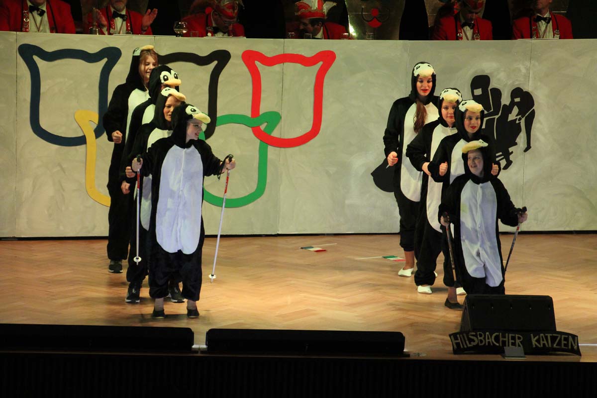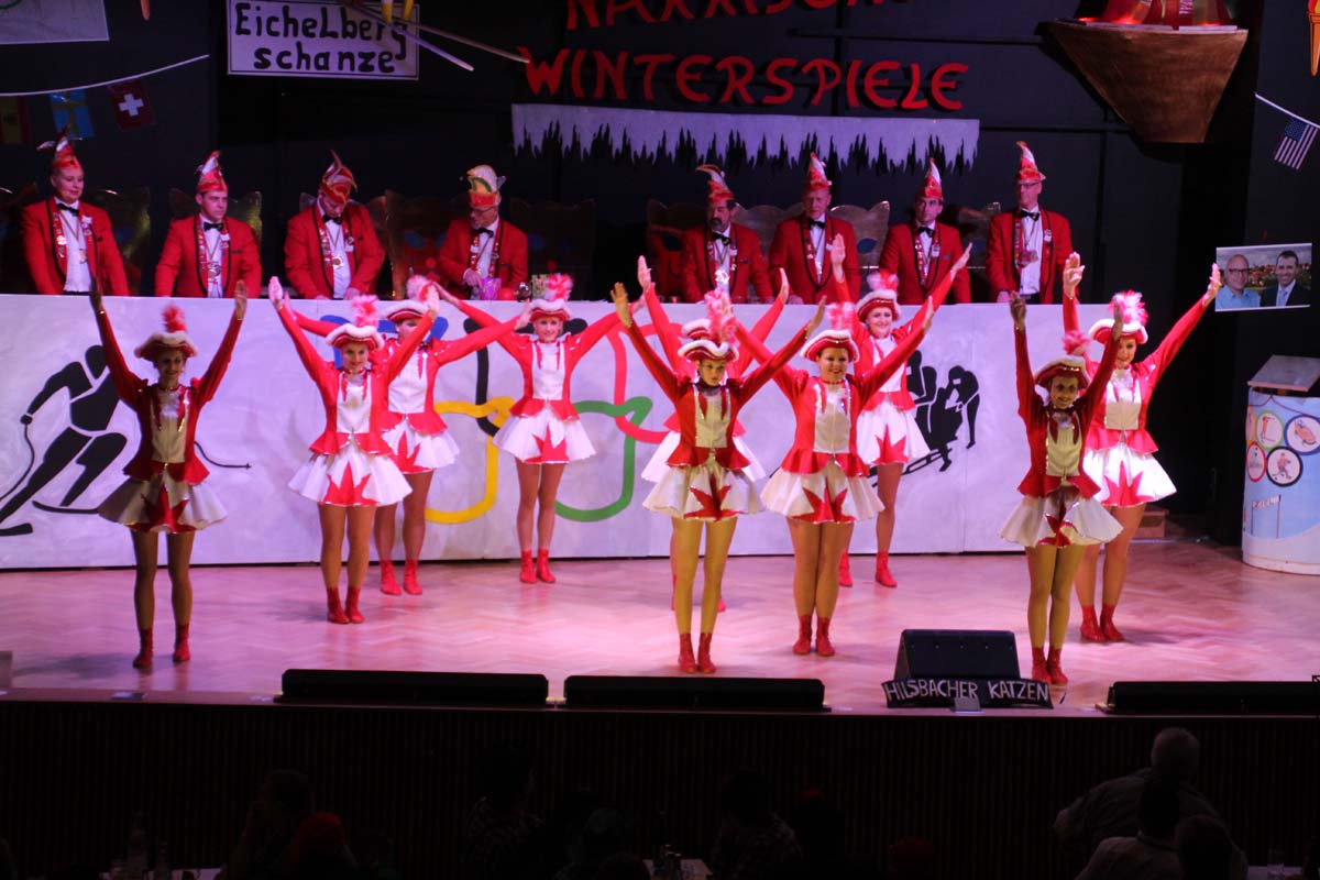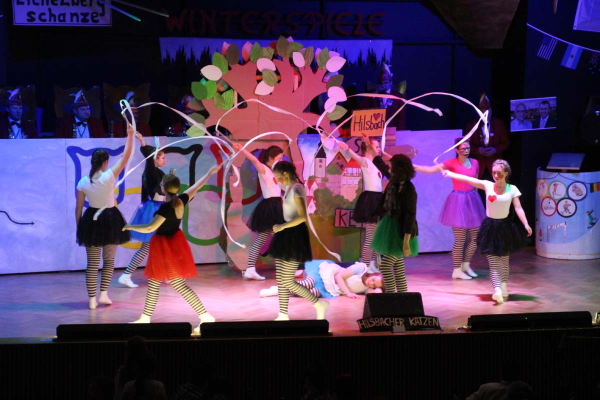 Feierlich wurde die Veranstaltung mit einer Fackel das närrisch olymische Feuer entzündet. Dann standen auch schon 116 Akteure bereit das ausverkaufte närrische Haus zu unterhalten. Bereits der Einmarsch auf die Bühne zeigte ein herrliches Bild. Und dann ging auch schon die Post ab. Die tanzenden Pfötchen, die jüngste Truppe der Hilsbacher Katzen, tanzten sich mit Frosty the Snowman und Ice Baby nicht nur in die Herzen ihrer Eltern, sondern verzauberten auch das Publikum mit ihrer tollen Show. Was wäre der Hilsbacher Fasching ohne eine närrische Bütt über das vergangene Dorfgeschehen. Katz und Katz hatten da so einiges zu erzählen und auch auch OV und OB mussten sich so einiges sagen lassen. Gute Nachwuchsarbeit zeigte sich bei der neuen Kleine Garde. Den Applaus für ihre tolle Leistung hatten sie sich redlich verdient.