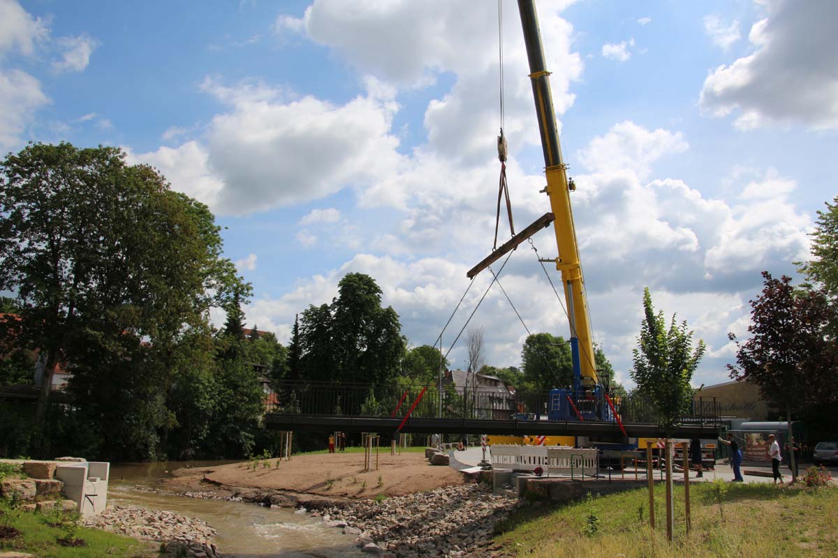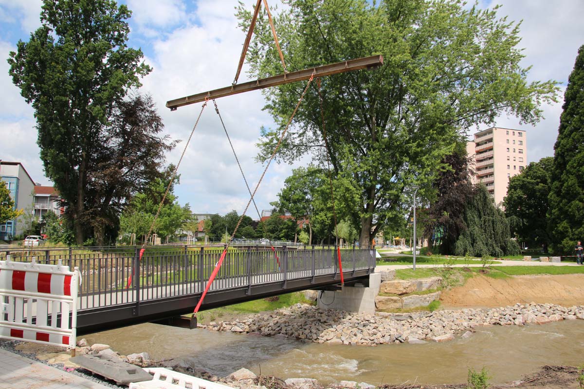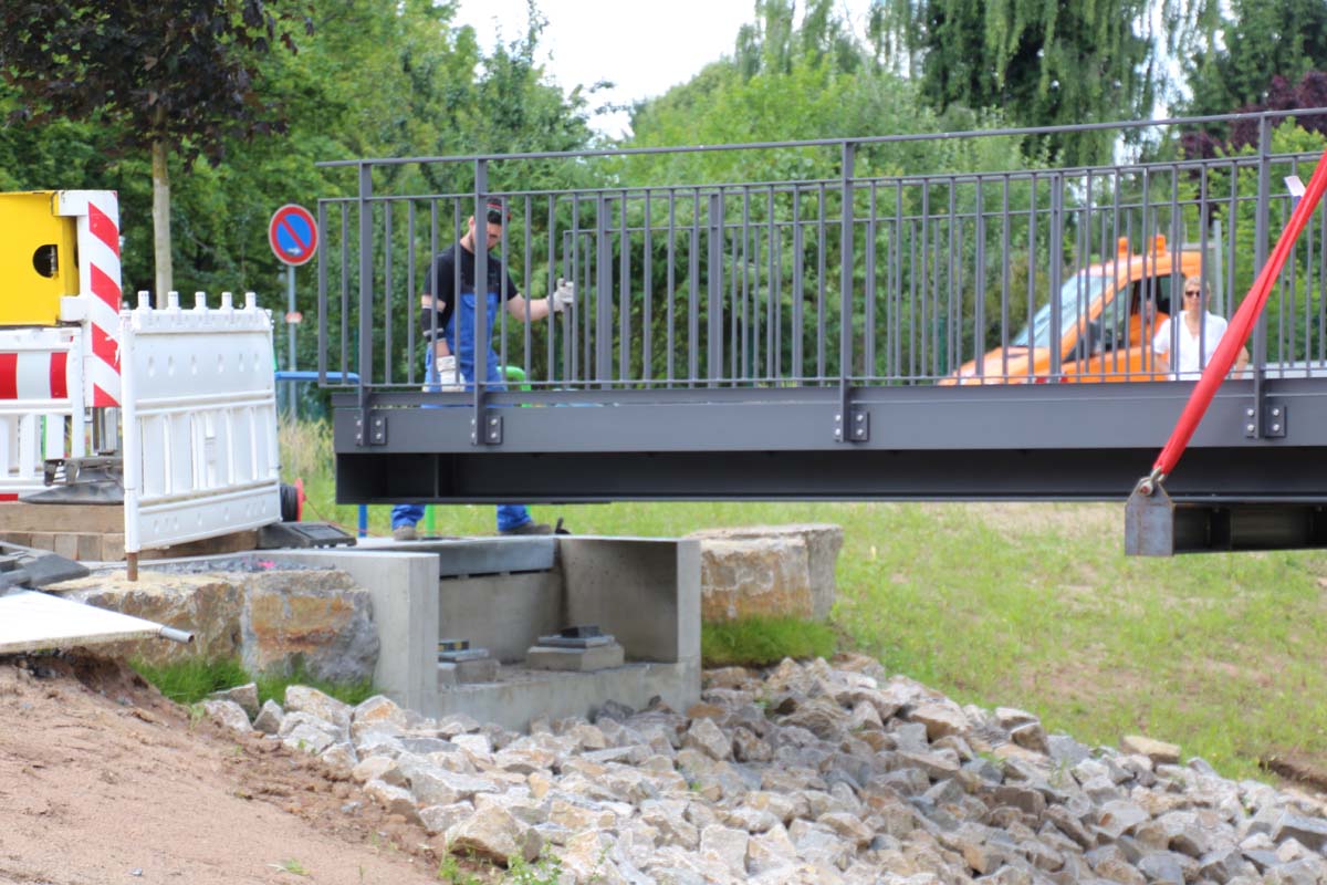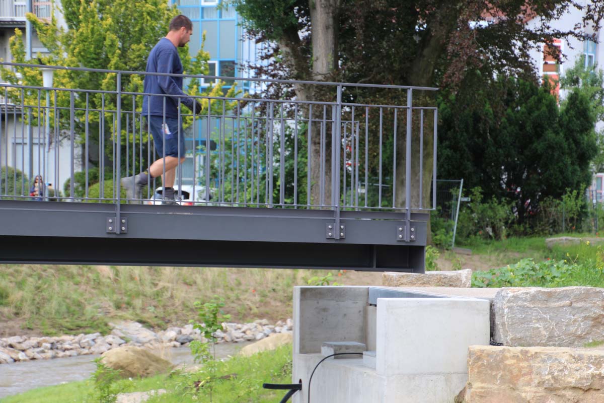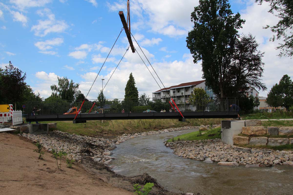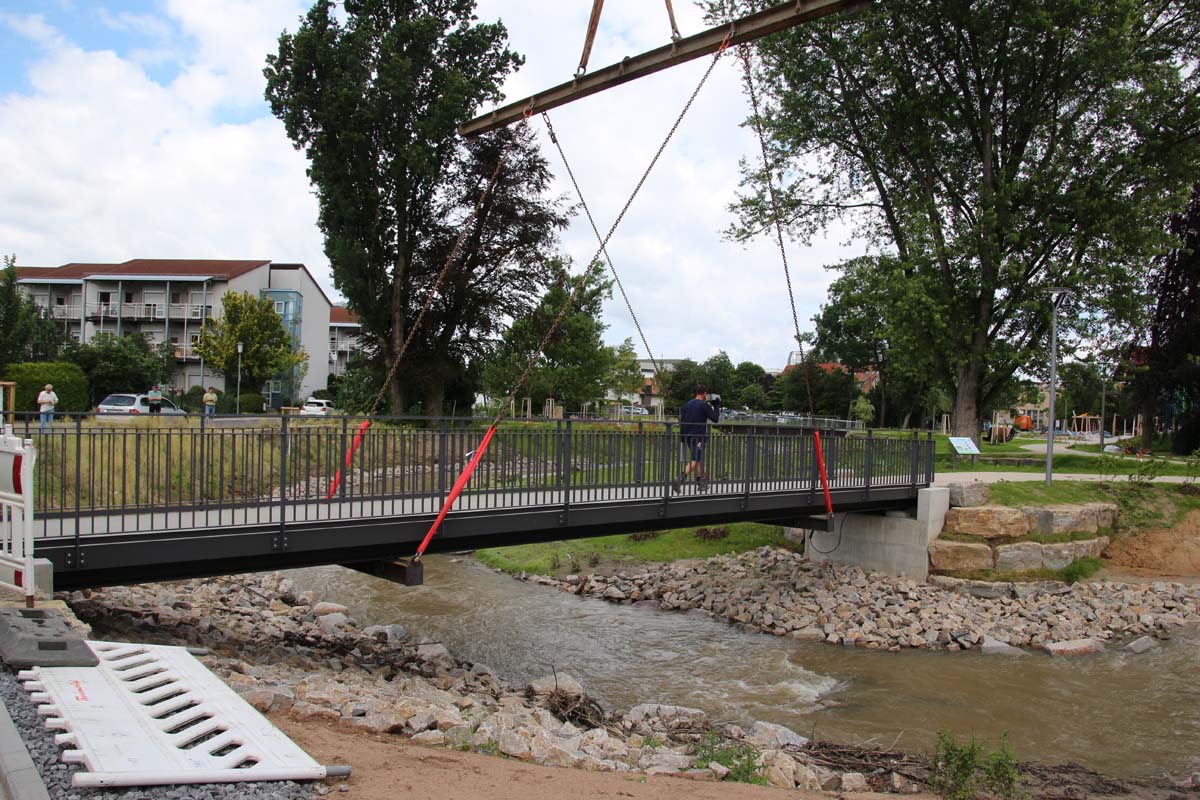(cr) Nun ist es fast geschafft. Kurz vor der grossen Eröffnung des alla hopp! Parkes im Sinsheim wurde als einer der letzten grossen Teile diese neue Brücke über die Elsenz eingefügt. Sie fügt sich hervorragend in das neue Bild des ehemaligen Postgartens ein.