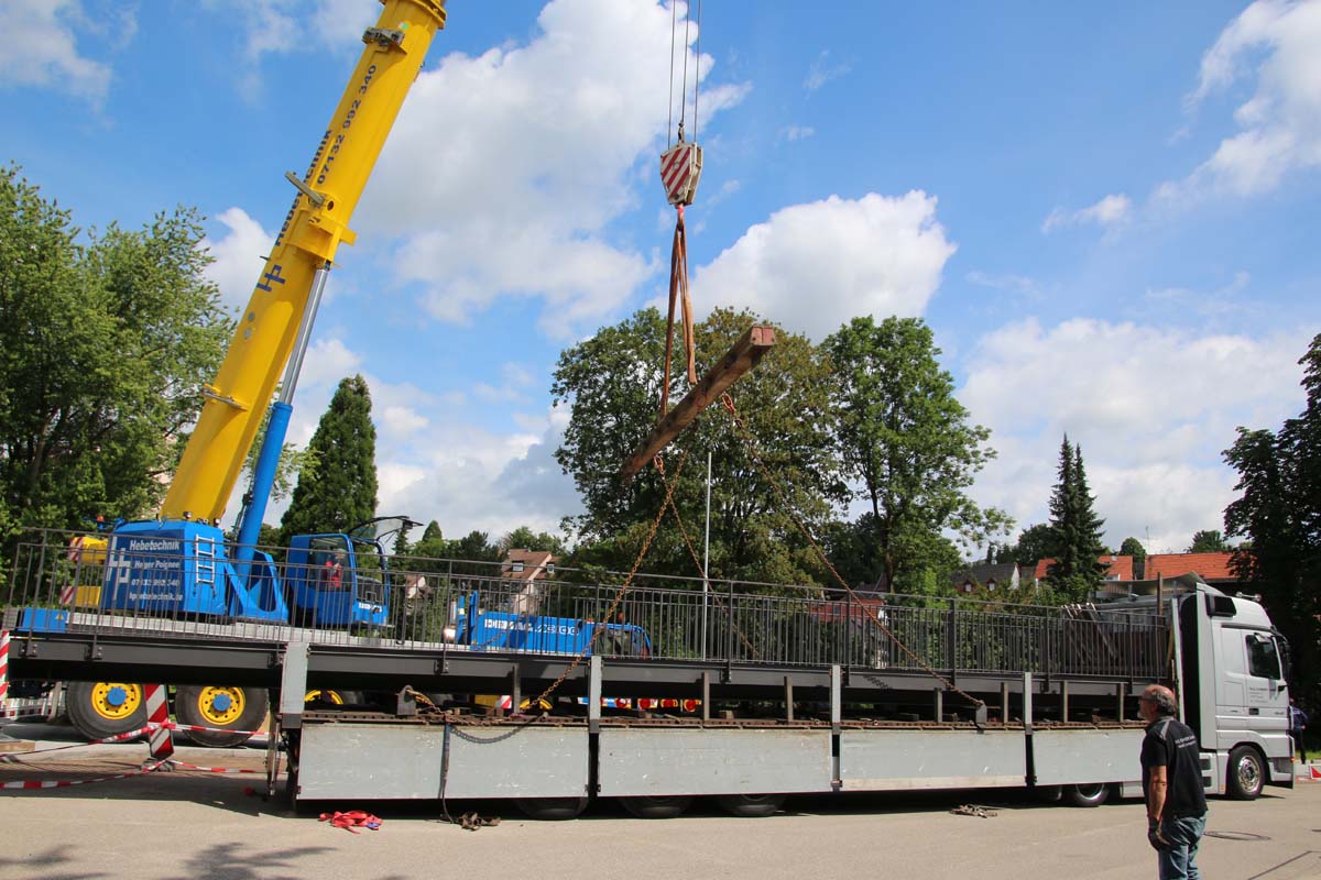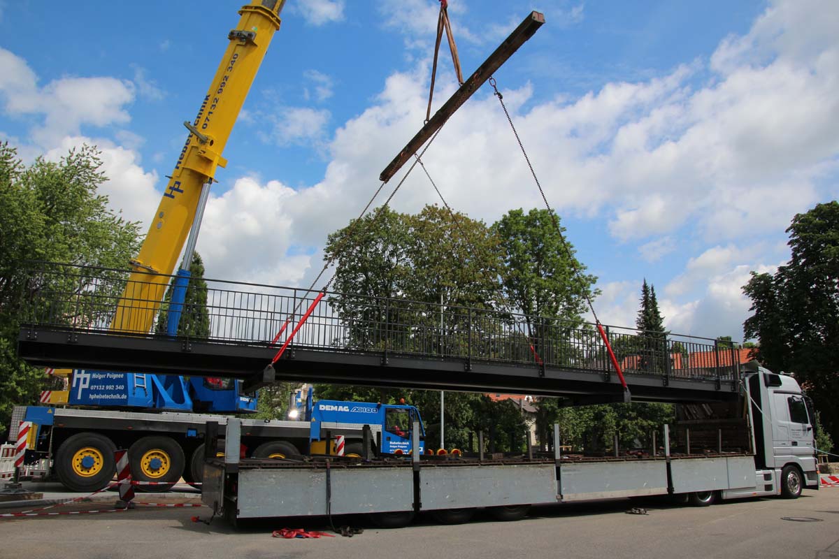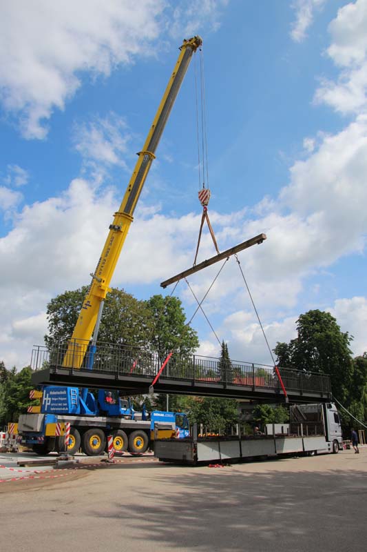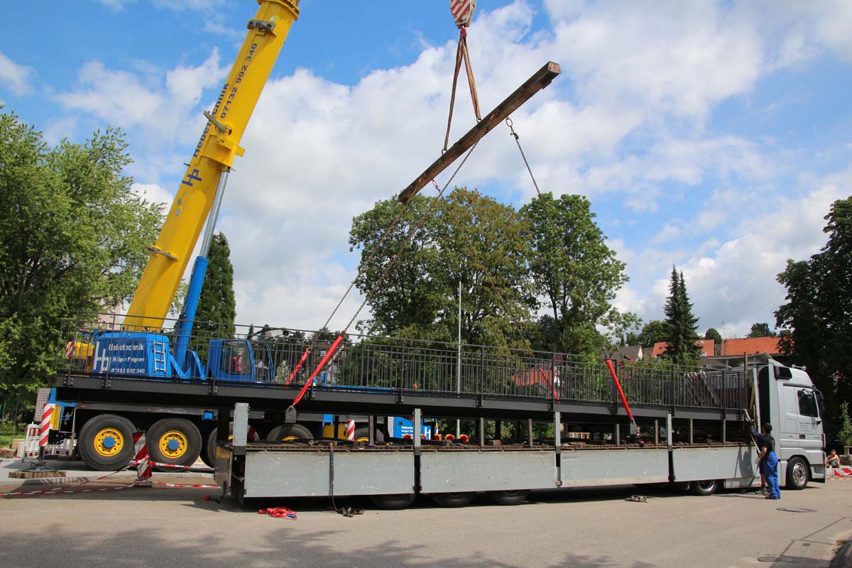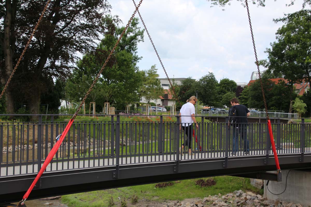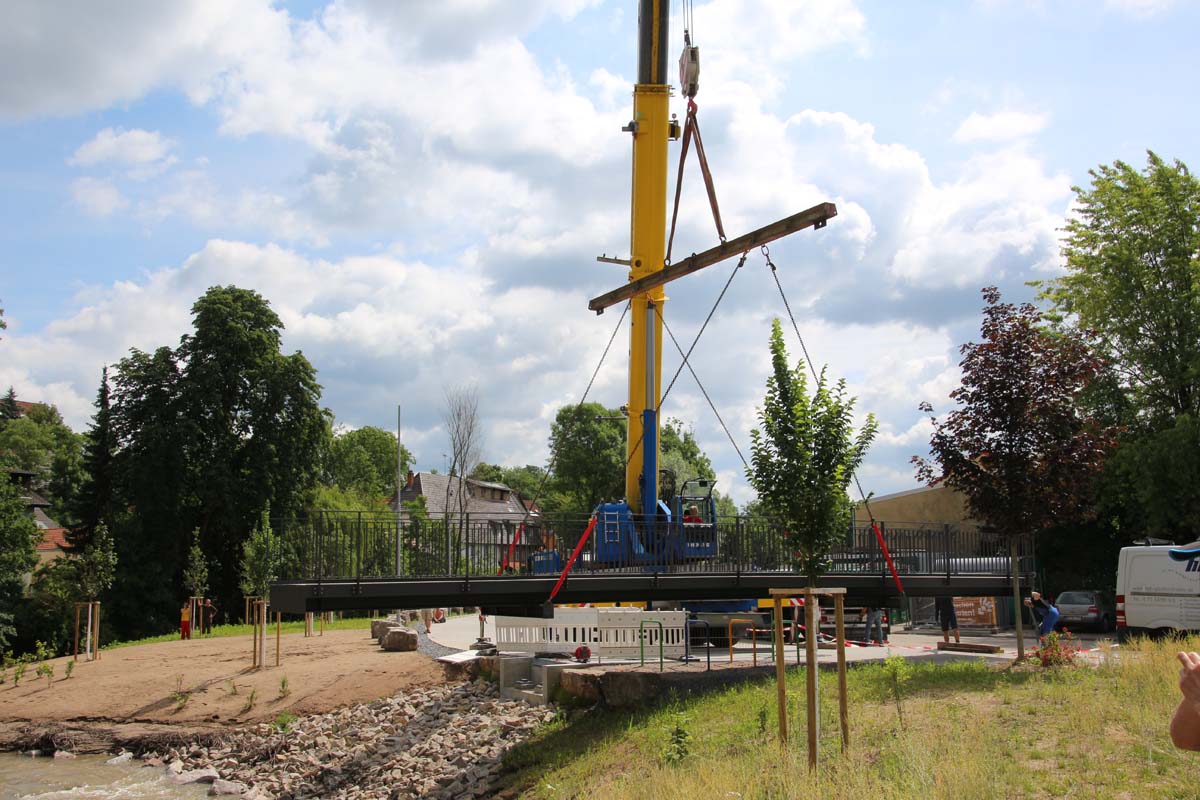 (cr) Nun ist es fast geschafft. Kurz vor der grossen Eröffnung des alla hopp! Parkes im Sinsheim wurde als einer der letzten grossen Teile diese neue Brücke über die Elsenz eingefügt. Sie fügt sich hervorragend in das neue Bild des ehemaligen Postgartens ein.
