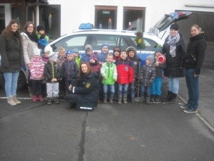 Die netten Polizisten brachten den Kindern das richtige Verhalten im Straßenverkehr näher. Außerdem wurde besprochen, dass sie nicht mit Fremden mitgehen sollen, da böse Menschen nicht auf den ersten Blick zu erkennen seien. Danach ging es nach draußen, um gemeinsam mit der Polizei zu üben wie man richtig über die Straße überquert.