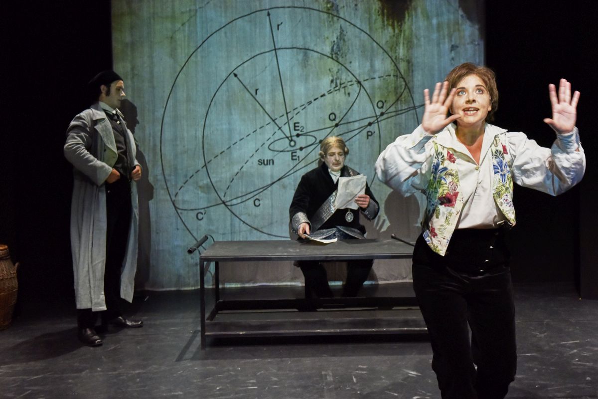 Ausgehend von Daniel Kehlmanns humorvollem Abenteuerroman über den Mathematiker Carl Friedrich Gauß und den Naturforscher Alexander von Humboldt, hat die Landesbühne die neue Saison unter das Motto „Weltgeschichten“ gestellt. In der Eröffnungsinszenierung von Arne Retzlaff geht es also um zwei der bedeutendsten Wissenschaftler des beginnenden 19. Jahrhunderts, die mit ihren Forschungen, auf je unterschiedliche Weise, herausfinden wollten, was die Welt im Innersten zusammenhält. Während der Empiriker Alexander von Humboldt, der in diesem Herbst seinen 250. Geburtstag feiern würde, sich durch Urwald und Steppe kämpfte, den Orinoko befuhr, in Erdlöcher kroch, die höchsten Berge bestieg und unzählige Selbstversuche machte, bewies der Analytiker Gauß die Krümmung des Raumes von seinem Schreibtisch aus. Kehlmanns fiktive Doppelbiographie beginnt mit der Reise von Gauß zu einem Naturforscherkongress nach Berlin. Der eigenbrötlerische Misanthrop hat zwar wenig Lust, seine Heimatstadt zu verlassen, aber da ihn Humboldt mit Nachdruck eingeladen hat, besteigt er die Kutsche schließlich doch. Begleitet wird er von seinem Sohn Eugen, den Gauß für einen denkfaulen Versager hält. So kommt es, dass sich die beiden mittlerweile gealterten Geistesgrößen zum ersten Mal begegnen. In Rückblenden werden Szenen aus den höchst konträren Leben der beiden Genies erzählt. Während sie in Berlin darüber debattieren, wer seinem Lebensziel – der Vermessung der Welt – nähergekommen sei und was wahre Wissenschaft ausmache, verteilt Eugen Flugblätter für ein freies Deutschland und wird prompt verhaftet.