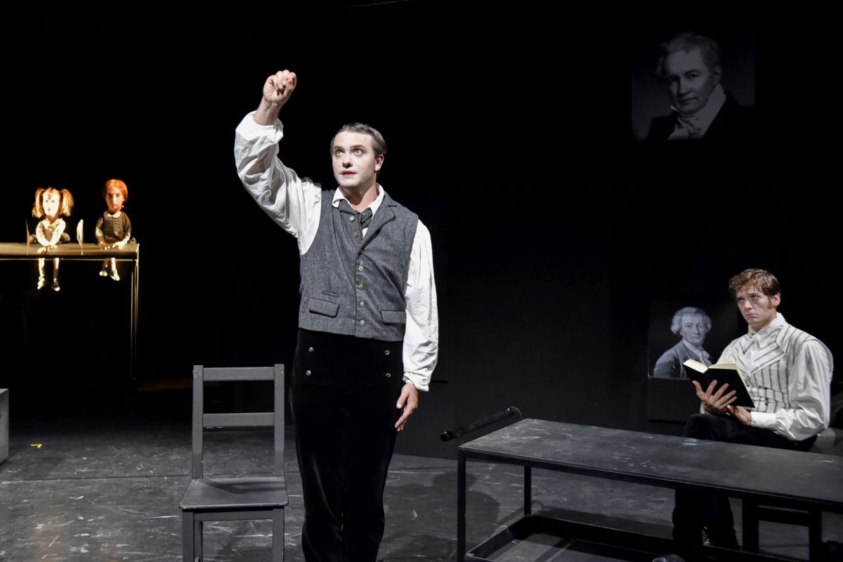 „Kehlmanns Roman ist ein raffiniertes literarisches Spiel mit Wirklichkeit und Fiktion und porträtiert zwei herausragende Wissenschaftler zwischen Scheitern und Erfolg“, so Regisseur Retzlaff. Ihn interessiere daran vor allem die unersättliche Wissbegier der beiden Forscher, ihre extreme Schaffensenergie und gleichzeitig ihre Überforderung in Bezug auf irrationale Phänomene wie Gefühle und Übersinnlichkeit. Um diese erzählerische Reise durch Raum und Zeit sinnlich auf die Bühne zu bringen, haben sich Retzlaff und Ausstatterin Ella Späte so einiges ausgedacht. Die Inszenierung verspricht durch Projektionen, Puppenspiel und Mittel des Schwarzen Theaters ein wahres Theaterfeuerwerk zu werden. „Im Zentrum der Inszenierung stehen aber eindeutig die Schauspielerinnen und Schauspieler“, so der Regisseur. Martin Behlert und David Meyer werden in den Hauptrollen zu sehen sein. Elena Weber, Sina Weiß, Hannes Höchsmann und Stefan Holm schlüpfen hingegen alle in mehrere unterschiedliche Rollen und tragen dazu bei, die Lebenswelten der beiden Protagonisten entstehen zu lassen. Es wird ein poetischer, spannender und witziger Theaterabend, denn Kehlmanns Roman besticht nicht nur durch seine schrulligen Figuren, sondern auch durch seine satirische Auseinandersetzung mit Größe und Komik deutscher Geistesgeschichte.