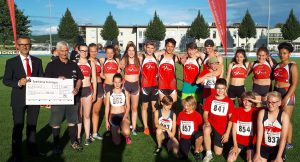 Bernd Eknigk, Regionaldirektor der Sparkasse Kraichgau (links), überreicht den Spendenscheck an Hubert Mickel, Abteilungsleiter Leichtathletik, und seine Nachwuchsathleten.