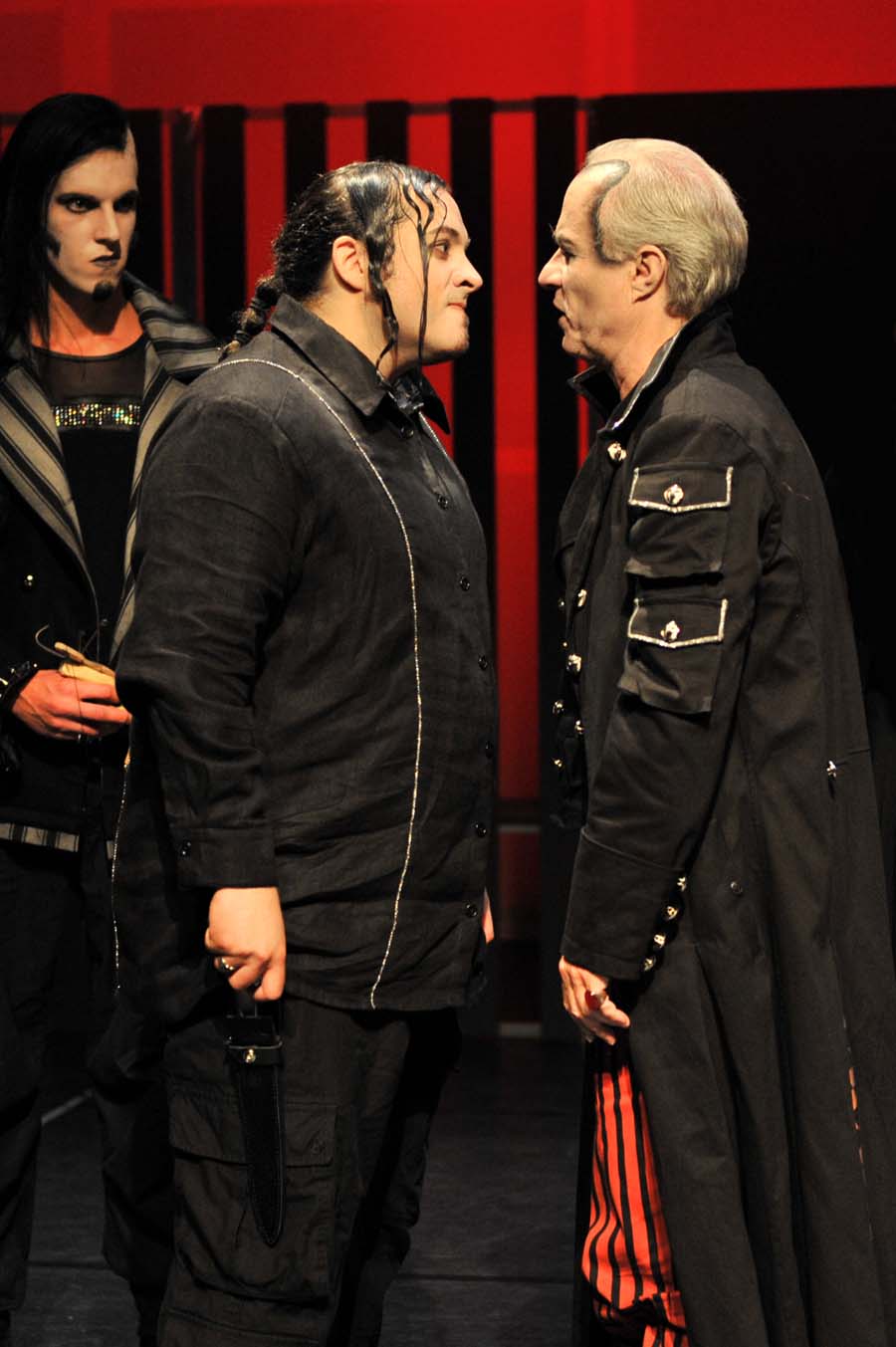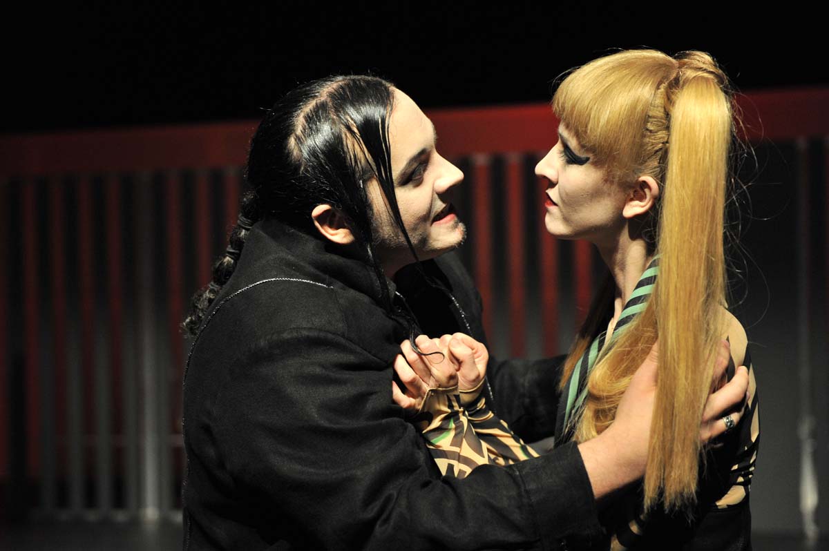 So scheint dies niemanden im Hofstaat zu stören, während Hamlet nahezu verrückt wird, weil seine Mutter-Tante nun mit seinem Onkel-Vater liiert ist. Besonders aufbrausend wird er, als er von Marcellus (Cornelius Danneberg) und Bernardo (Jessica Schultheis) erfährt, dass hinter dem Tod seines Vaters dessen Bruder und neue Ehemann seiner Mutter steckt.