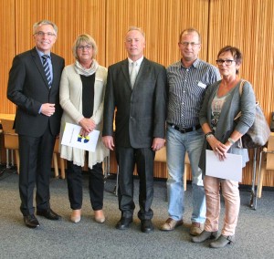 40-jährige Dienstjubiläen (Foto Landratsamt Rhein-Neckar-Kreis): Zum 40-jährigen Dienstjubiläum gratulierten Landrat Stefan Dallinger (links) und Personalrat Hüseyin Topaloglu (2.v.r.): (v.l.n.r.) Gabriele Blaskowitz, Jan Fuhrmann und Northild Ostermaier