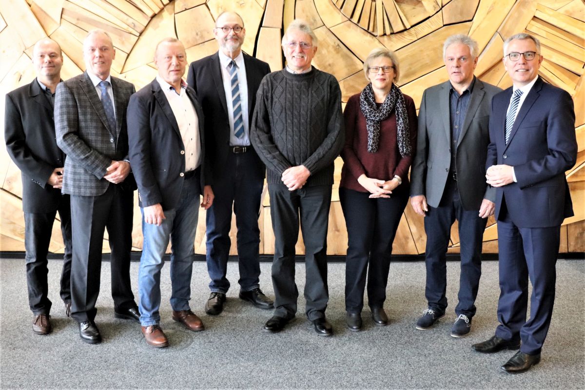 Landrat Stefan Dallinger (r.) und Horst Post (l.) vom Personalrat verabschiedeten (v. l.) Erich Diefenbacher (wohnhaft in Waibstadt, zuletzt im Amt für Gewerbeaufsicht und Umweltschutz beschäftigt), Theophil Kirsch (Sinsheim/Jugendamt), Franz Heidinger (Epfenbach/Amt für Gewerbeaufsicht und Umweltschutz), Helmut Welker (Waibstadt/Amt für Flurneuordnung), Christa Klatt (Mannheim/seit 1978 Sekretärin an der Hans-Freudenberg-Schule in Weinheim) und Peter Hillenbrand (Rauenberg/Amt für Schulen, Kultur und Sport) in den Ruhestand.