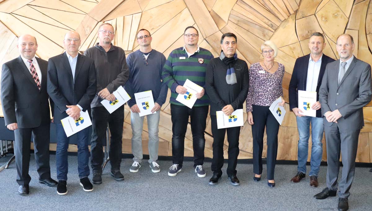 (Quelle: Landratsamt Rhein-Neckar-Kreis): Landrat-Stellvertreter Joachim Bauer (r.) und Personalrat Joachim Geiss (l.) beglückwünschten diese Kolleginnen und Kollegen zum 25. Dienstjubiläum (v. l.): Hans-Peter Wöllner (wohnhaft in Oftersheim, beschäftigt beim Amt für Landwirtschaft und Naturschutz), Jürgen Helm (Neckarbischofsheim/Straßenbauamt), Jochen Spannnagel (Rauenberg/Straßenbauamt), Stefan Haller (Dossenheim/Sozialamt), Ekrem Cengiz (Nußloch/Amt für Flurneuordnung), Renate Muth (Oftersheim/Haupt- und Personalamt) und Dr. Mihail Abrudean (Sinsheim/Veterinäramt und Verbraucherschutz).